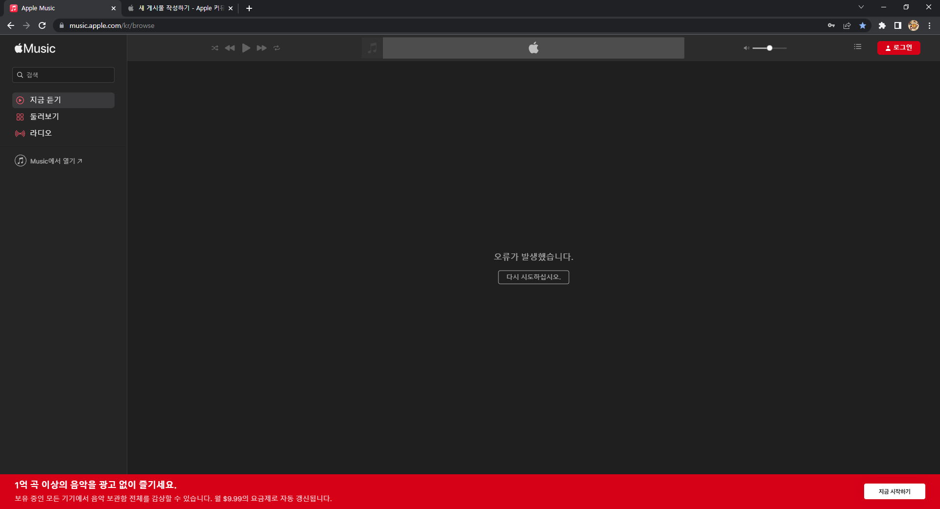 지금 듣기 페이지를 눌러보면 오류가 발생했습니다 다시 시도하십시오. 라는 문구가 뜹니다.
