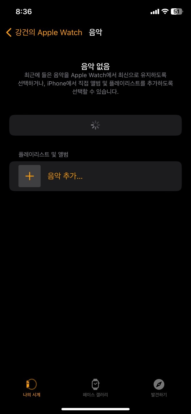로딩만 계속 되고 음악 추가를 해도 추가가되지 않습니다 어떻게 해결해야 할까요 아이폰, 워치 모두 소프트웨어는 최신입니다.