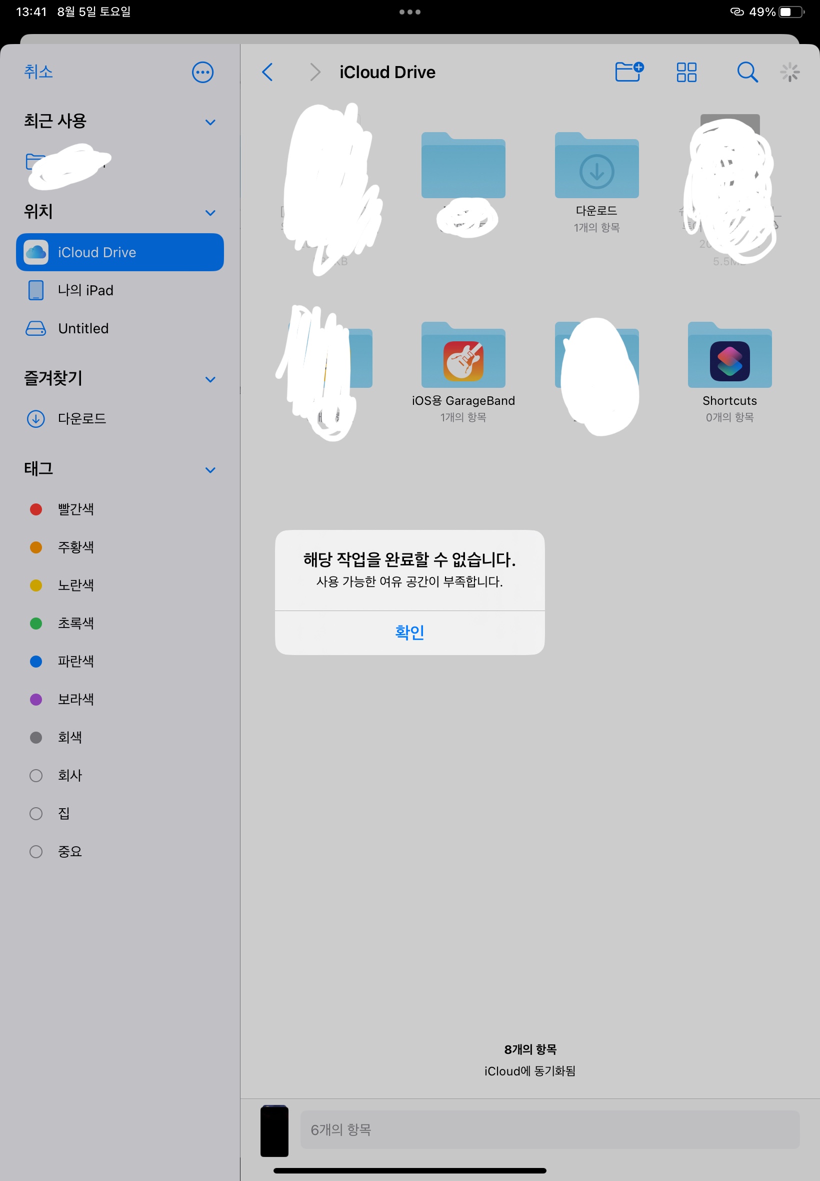 iPad Air에서 iCloud 200기가를 결제했는데 용량 큰파일을 iCloud 드라이브에 이동하려고 하니까 '사용 가능한 여유 공간이 부족합니다'라고 뜨는데 어떻게 해야하나요?