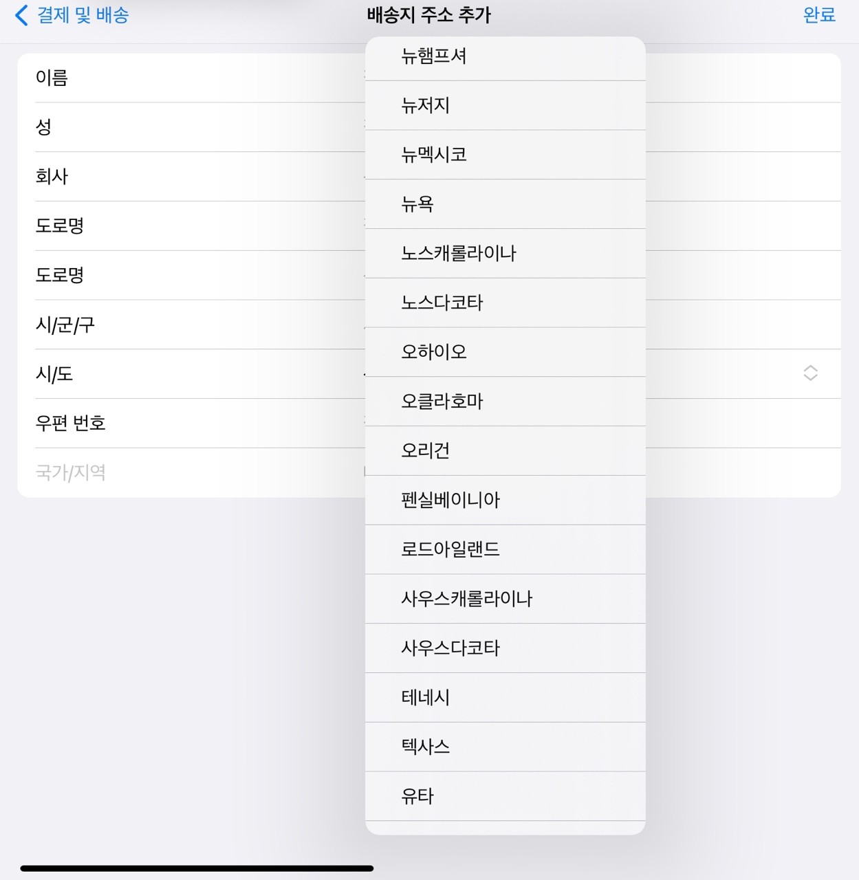 앱스토어에서 국가를 잠깐 미국으로 했다가 다시 대한민국으로 하려 하는데 다 미국으로 바뀐거 같습니다. 배송지 주소를 대한민국 주소로 하려하는데 시/도가 미국 도시로 나옵니다. 아래 국가/지역은 대한민국으로 되있습니다.