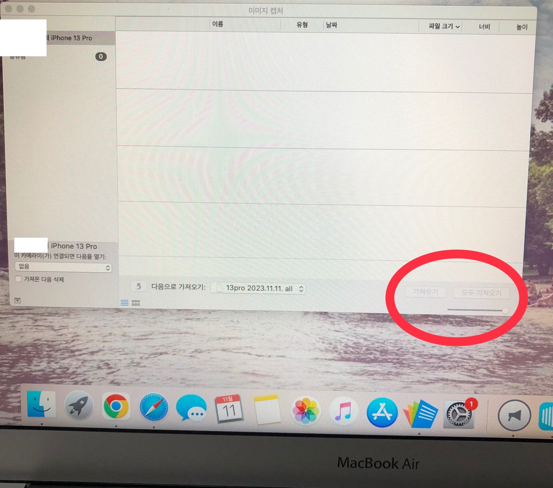 MacBook 이미지캡쳐를 이용해 폰 연결 후 사진을 가져온다 하고 나서연결은 됐는데 사진 동영상 안 뜨고 가져오기 버튼도 활성화 안 되는데 왜 그런걸까요?