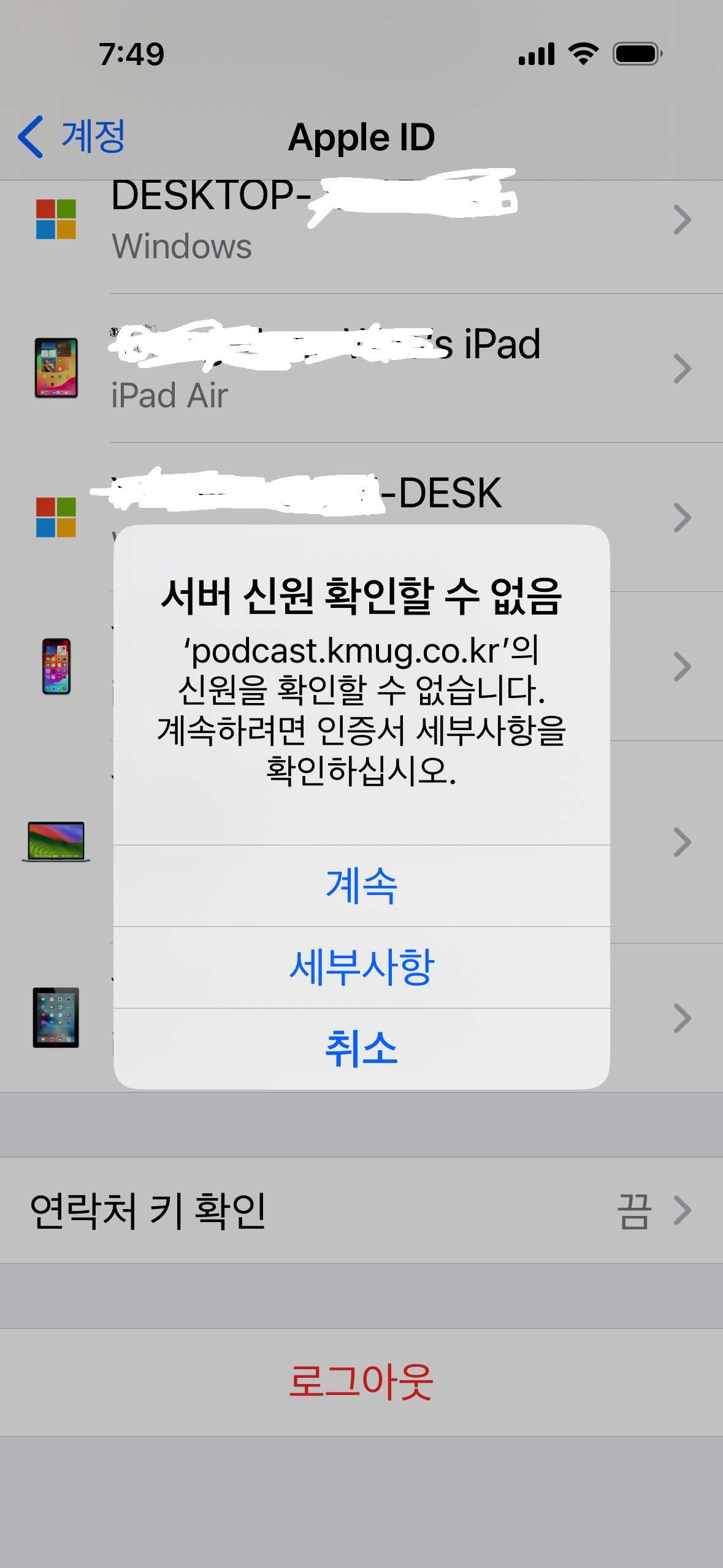 iPhone 15와 iPad에서 '서버 신원 확인할 수 없음'이 뜨는데 이것이 Known Issue 인가요? 어떤 앱이 해당 서버를 백그라운드에서 접근하는 지 알 수 있는 방법이 있을까요?