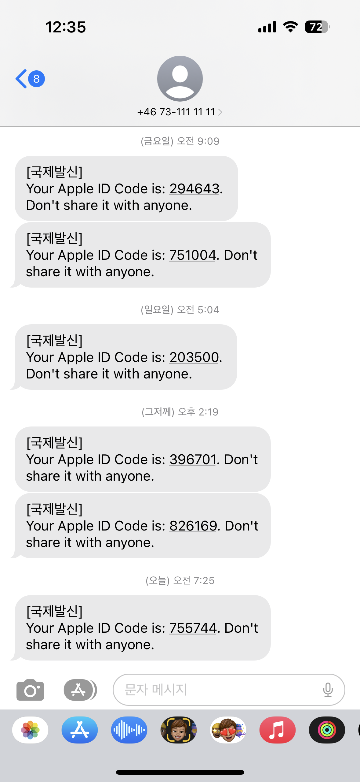 요청하지 않은 국제발신 Apple ID 확인 코드가 최근 너무 자주옵니다.
