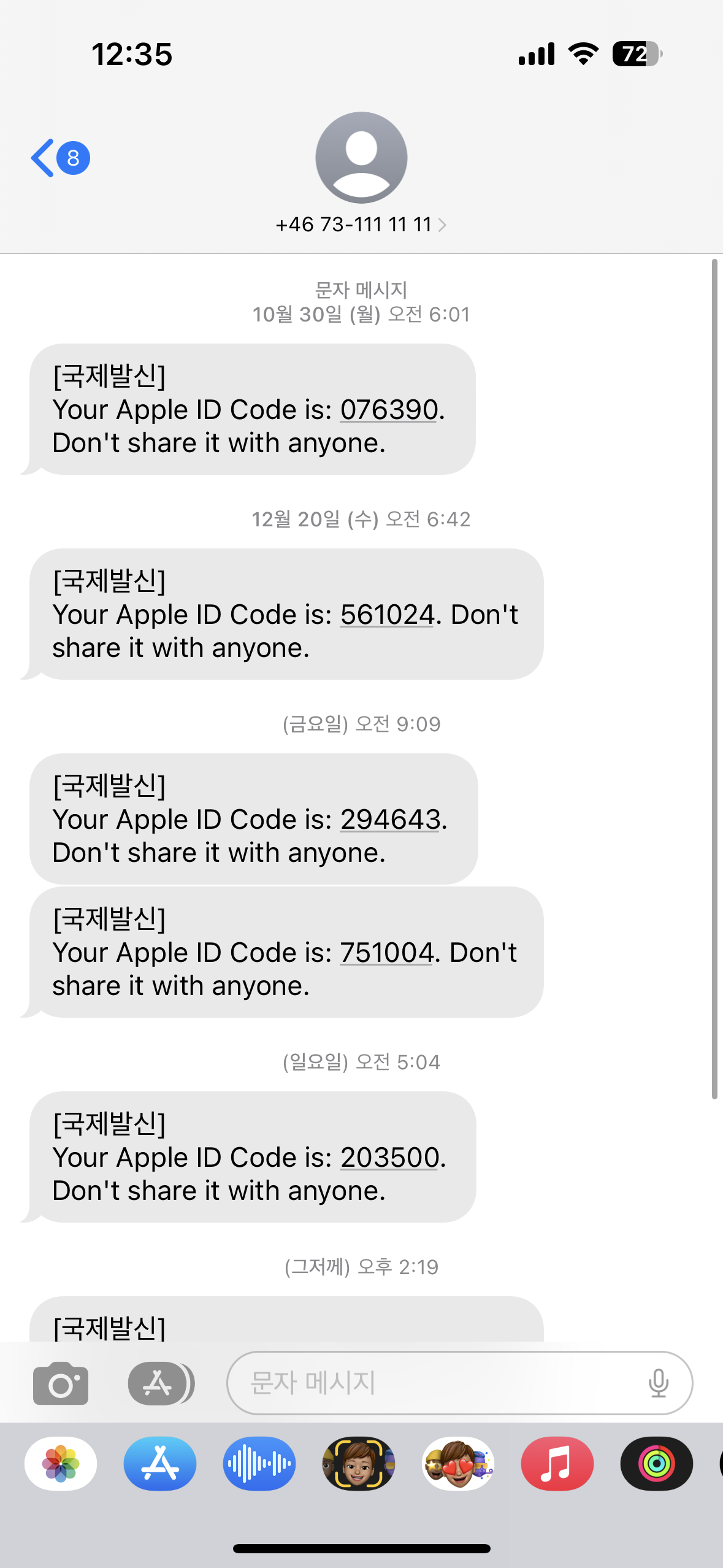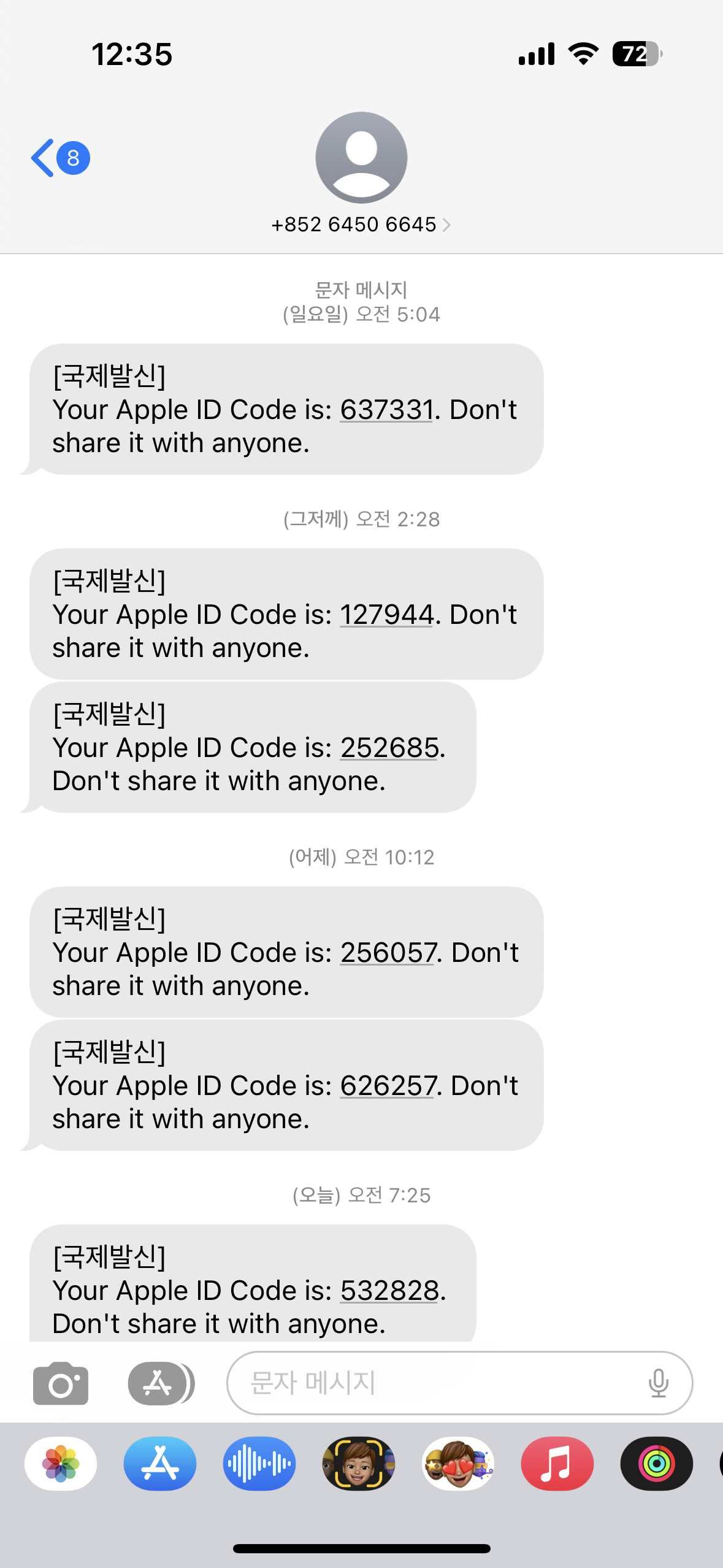 요청하지 않은 국제발신 Apple ID 확인 코드가 오는데 이대로 나두어도 보안상 문제가 없을까요? 어디서 발송된건지 확인하는 방법이나, 더이상 문자가 안오도록 하는 방법 있을까요?