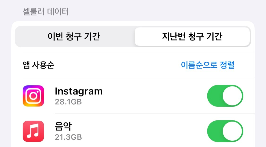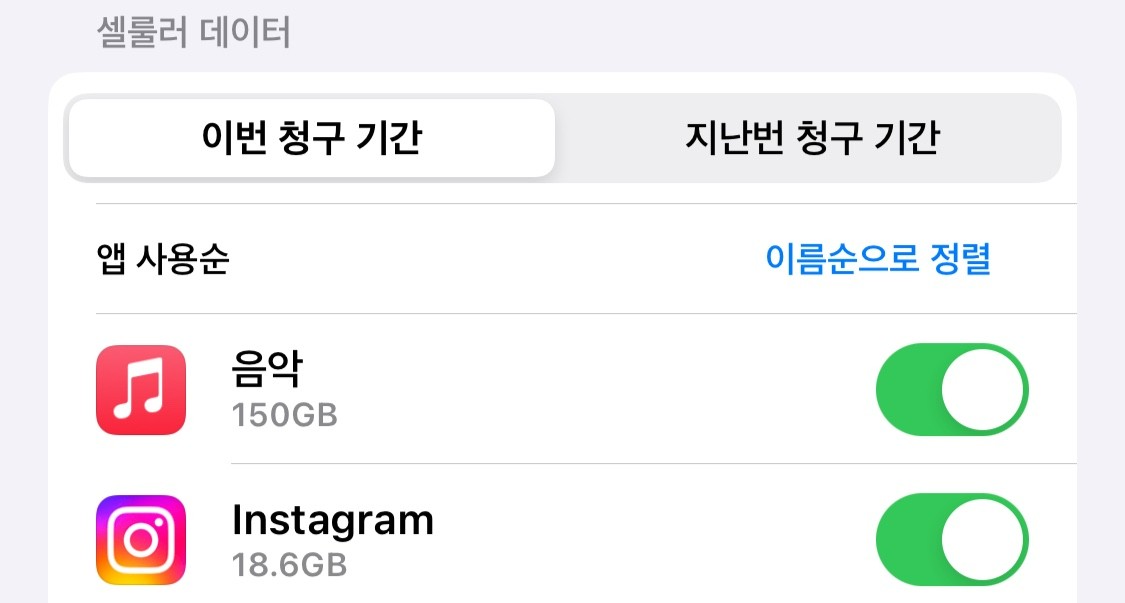 며칠 전부터 계속 요금제 데이터가 새벽에 얼마 썼고 얼마 남았다 라는 문자가 계속오더니 결국 1월이 끝나지도 않은 지금 요금제 데이터를 다 썼다고 해서 급하게 이것저것 확인해보니 애플뮤직으로 셀룰러 데이터를 무슨 150기가를 사용했다고 되있네요...