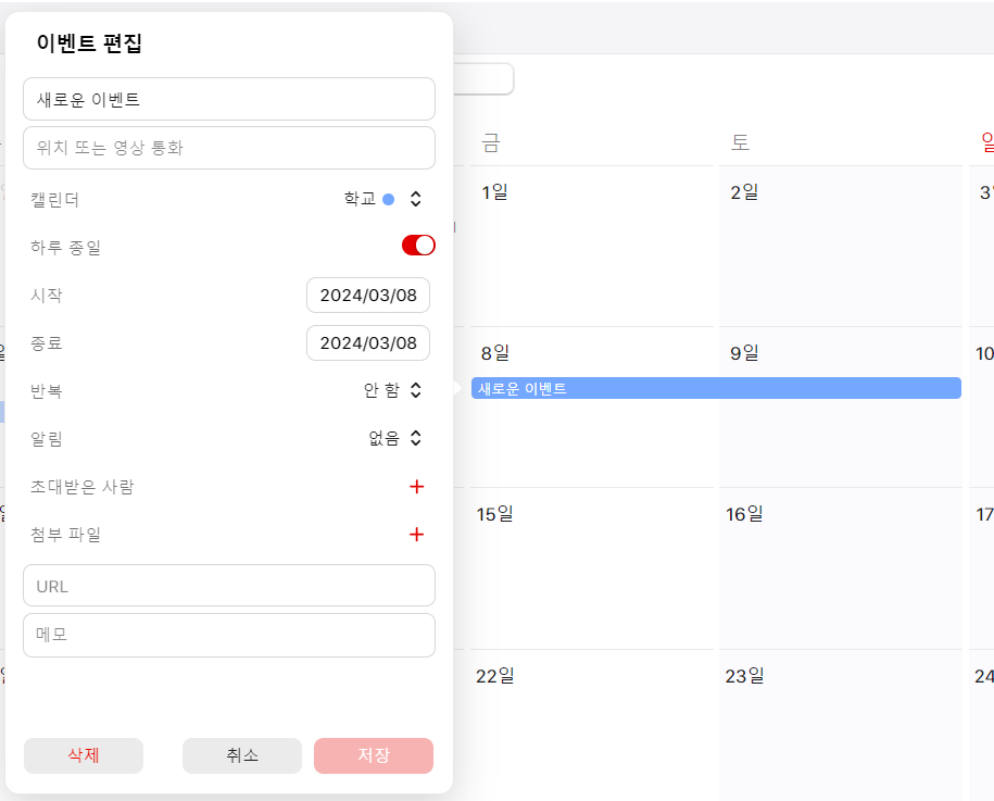 예를 들면, 일정을 3월 8일 하루종일 설정하면 -> 캘린더에는 3월 8일~9일로 표시되지만, 실제로 일정 상세정보를 보면 8일 하루로 설정되어 있습니다.