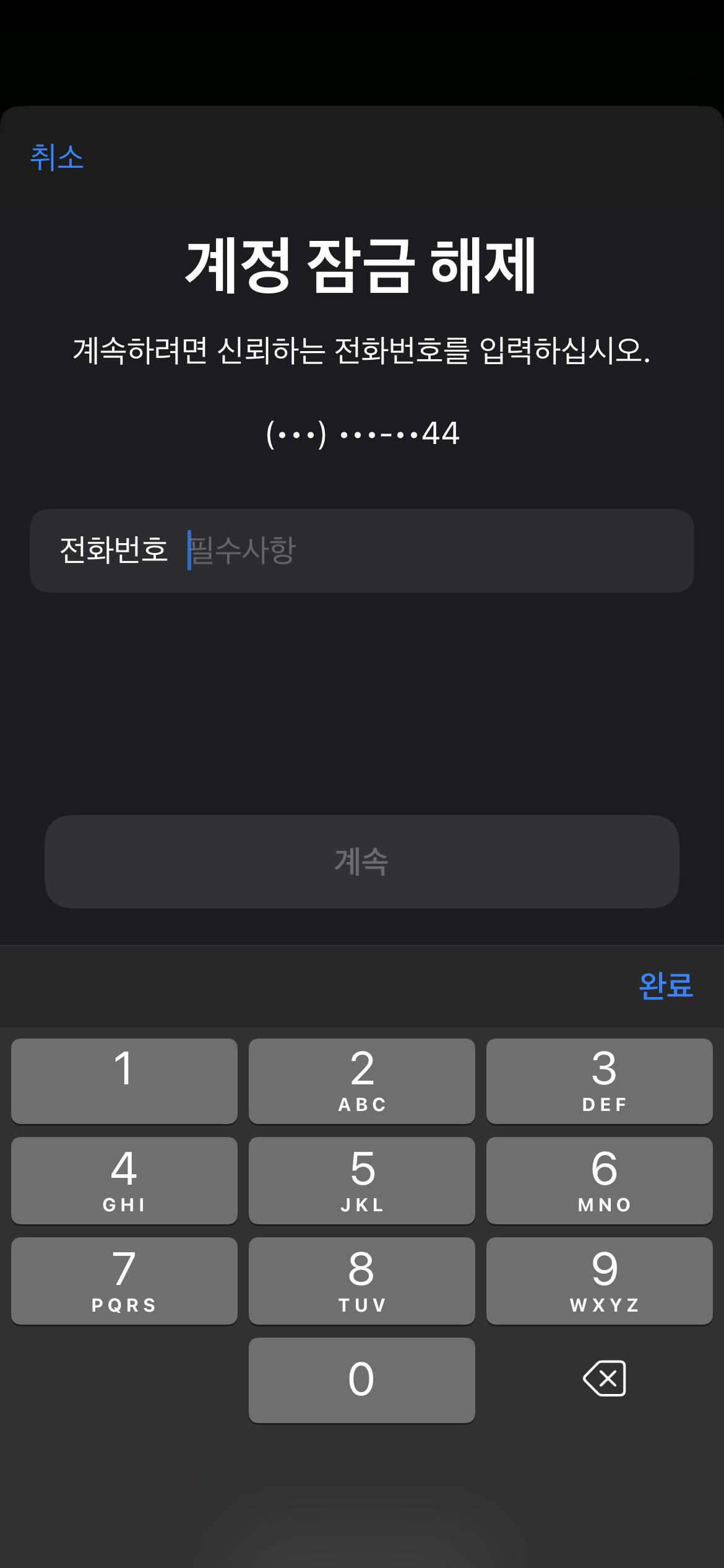 Apple ID 로그인 시 보안상의 이유로 계정이 잠겼다고 해서 계정잠금해제를 눌렀는데 제 번호를 눌러도 올바르지 않은 번호라고 뜹니다. 제 전화번호의 뒷자리가 아닌데 이거 어떻게 해결 못하나요?