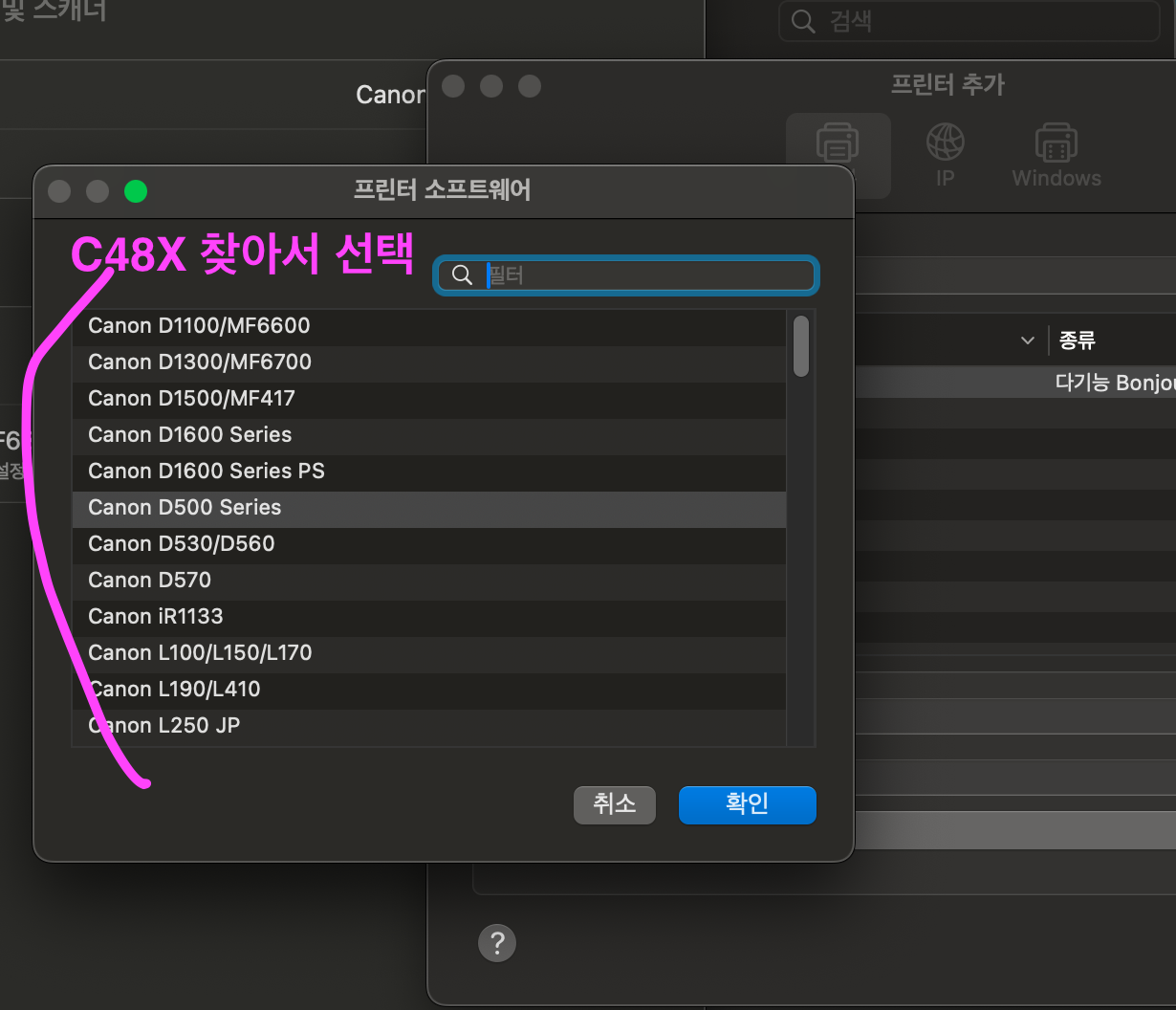 : 팝업된 창에서 Samsung C48X 와 비슷한 글자가 있으면 선택 후 확인을 누릅니다.