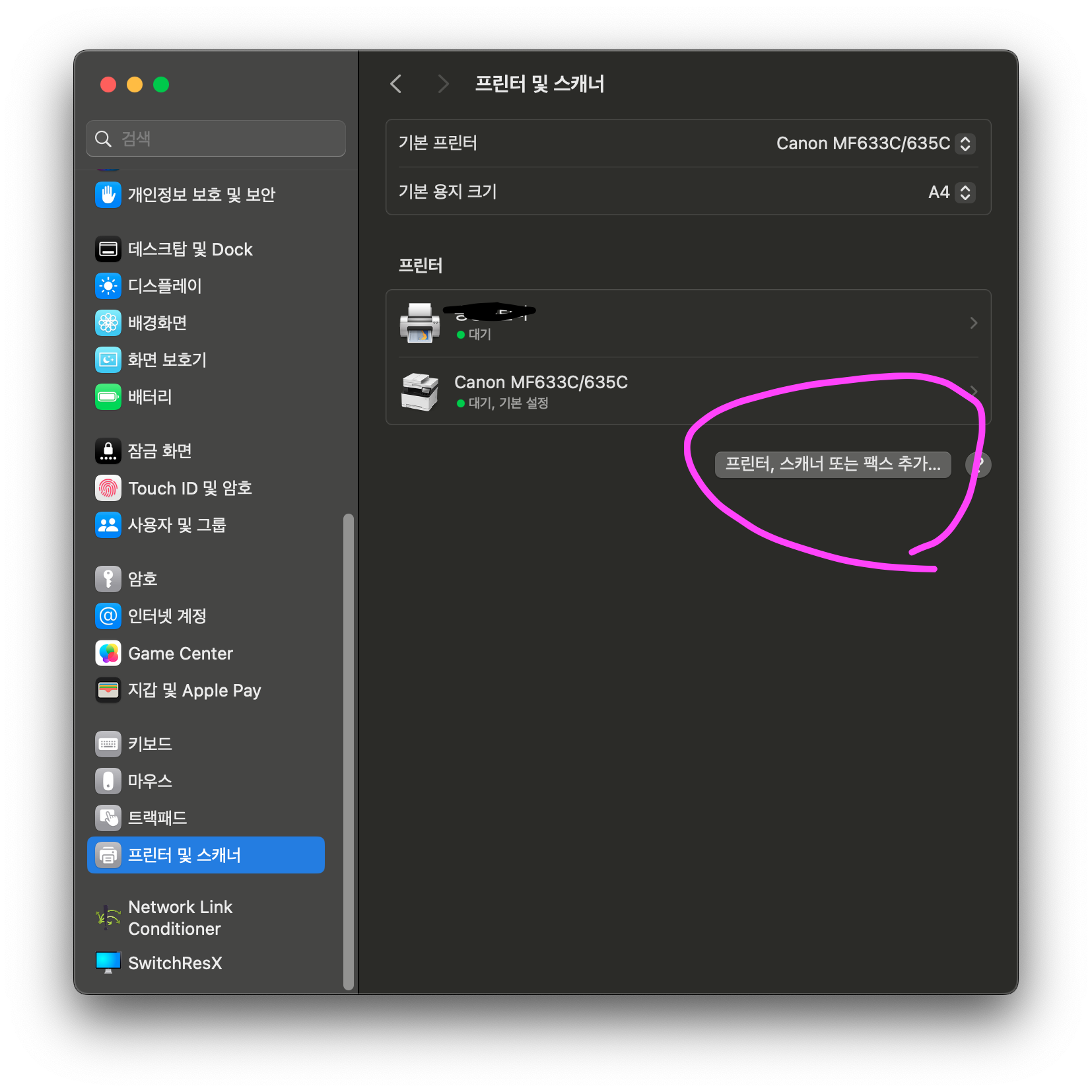 : 프린터 설치 관련 SW를 설치하신 후, 시스템 설정 > 프린터 및 스캐너 > 우 하단 프린터 추가 버튼을 클릭합니다.