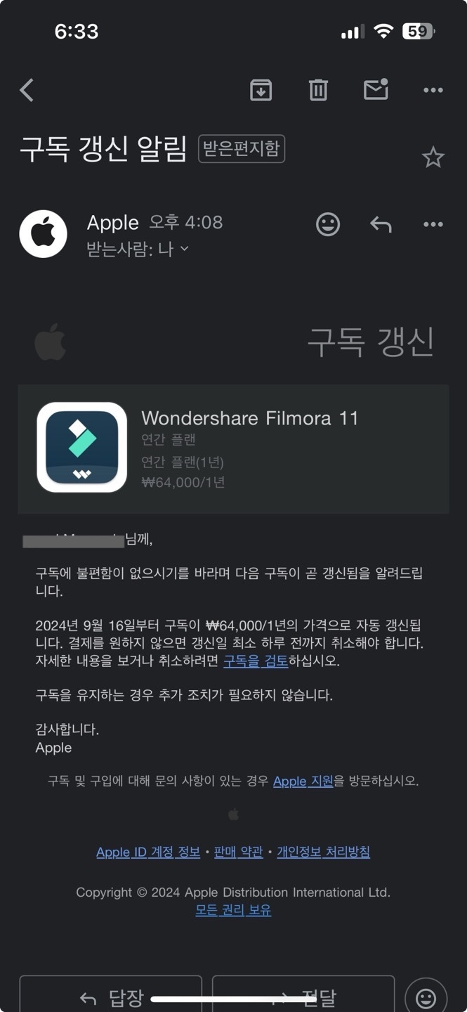 [wondershare 필모라] 라고 하는 동영상편집 앱을 사용했어요. 처음엔 정기 구독 인줄 모르고 지냈는데, 올 해 9월에 정기 결제를 예고하는 메일이 왔어요. 애플로 부터 온 메일입니다.