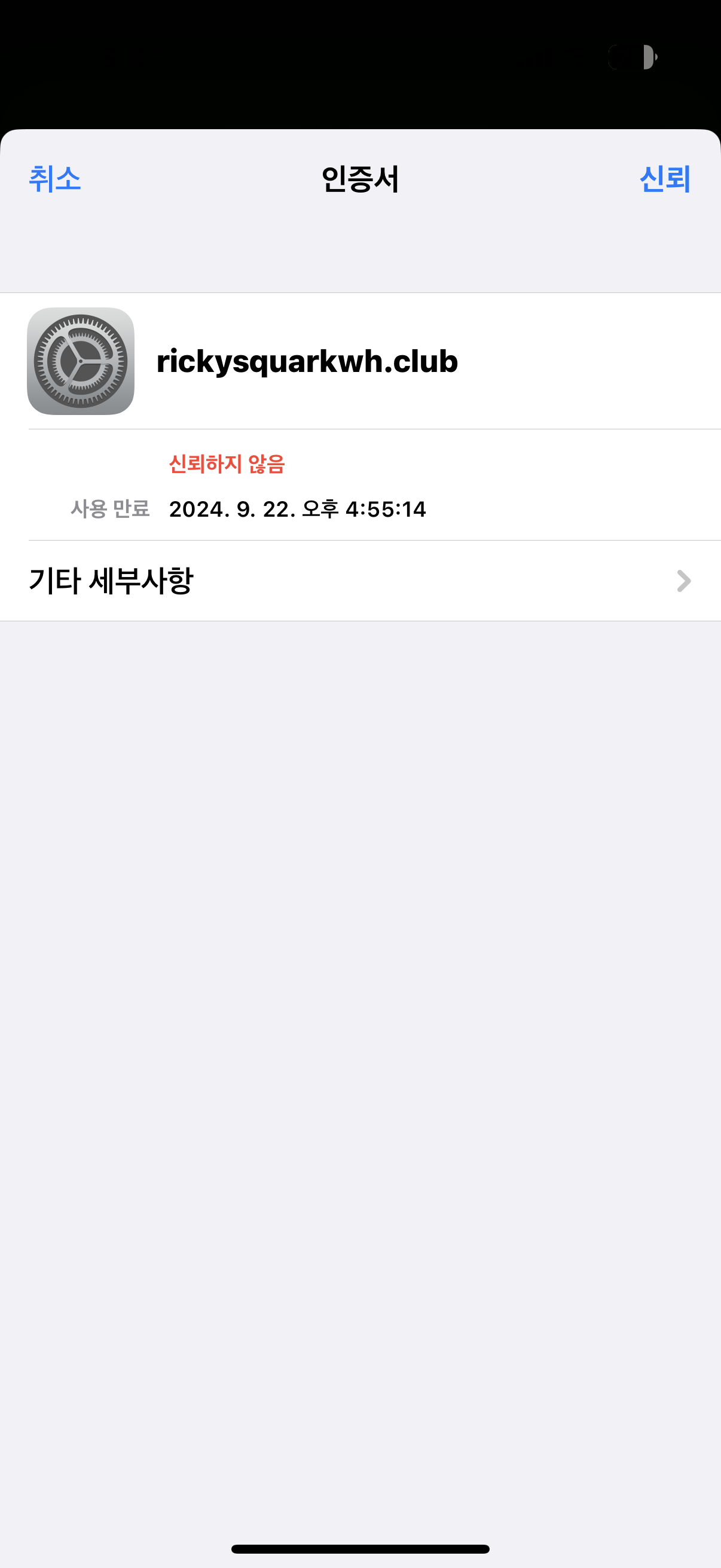 다음 사용자의 사용자 프로파일: woo984 woo984 사용자 레벨: 레벨 3 919 포인트 인성100 님에게 답변 2024. 9. 26 오전 01:54 신뢰하지 말고 취소하시고 저런 인증서를 사용하는 앱을 찾아서 해당 앱을 삭제하고 재설치하셔야 합니다. 답글 링크