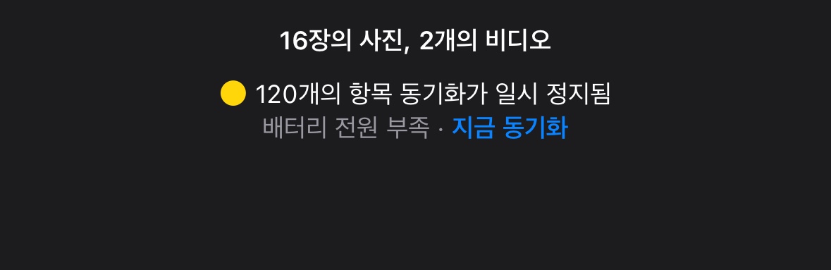 iCloud 사진이 기기에 동기화되지 않는 경우 - Apple 지원 (KR) 에 의하면 “기기가 저전력 모드에 있거나 기기의 배터리 전원이 부족한 경우 iCloud 사진 동기화가 일시 정지됩니다. 사진을 iCloud에 동기화하려면 기기의 배터리를 충전하거나, 저전력 모드를 끄거나, 상태 메시지 옆에 있는 '지금 동기화'를 탭하면 됩니다.” 라고 합니다.