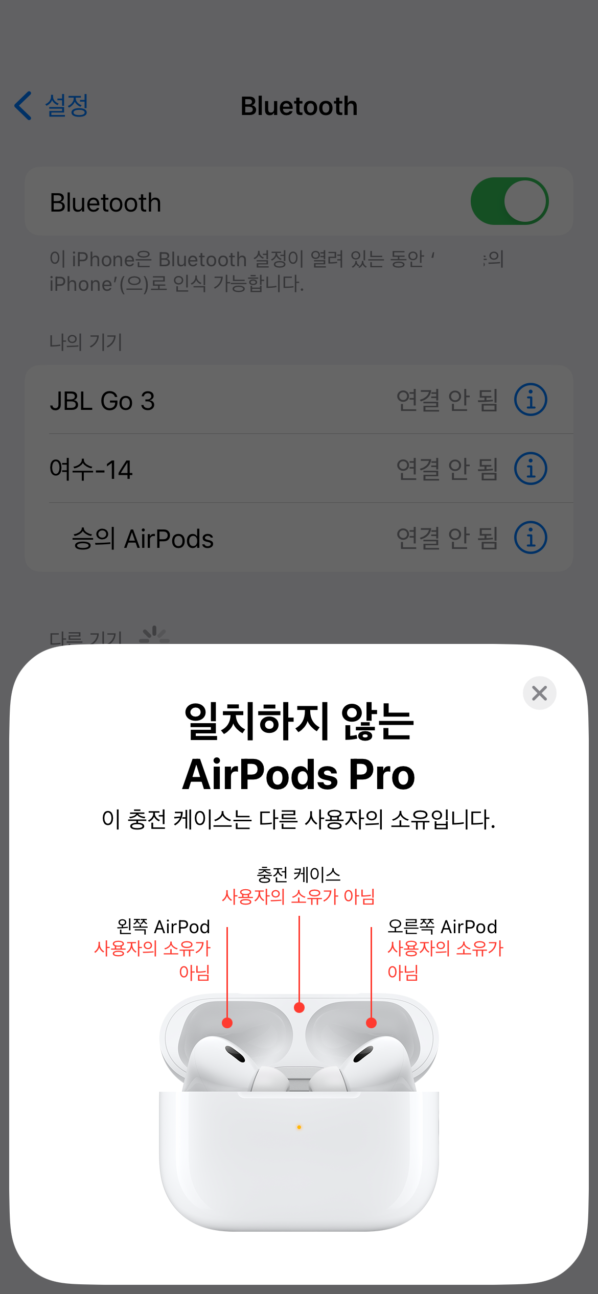 제가 에어팟을 새로 샀다가 알맹이 두개만 잃어버려서 그거 다시 사고 페어링해서 잘 쓰고 있었는데 왼쪽을 다시 잃어버려서 이번에 다시 왼쪽만 새로 샀거든요 근데 이번엔 기기 지우고 다시 연결하려니까 저렇게 떠요 ㅠㅠ