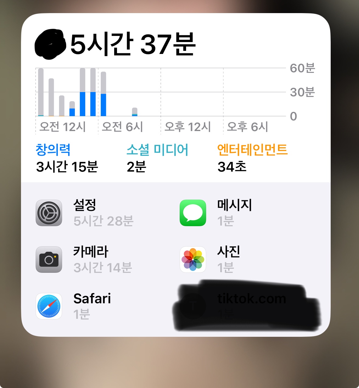 제목 그대로 카메라를 안썼는데 5시간 정도 잡혀요 제가 1시 30쯤 잠에 들면서 유튜브는 시간제한 걸려있어서 사파리로 유튜브 백그라운드 노래 들으면서 항상 자는데 그럼 원래 사파리나 유튜브가 시간이 잡혀야되는데 뜬금없이 카메라가 잡혀요 전 카메라 잘 안쓰고 B612 쓴단말이에요 그래서 지금 폰도 못하고 급하게 문자해야하는데 1분만 써도 안되서,,,,,, 아 그리고 설정도요ㅜㅜㅜ