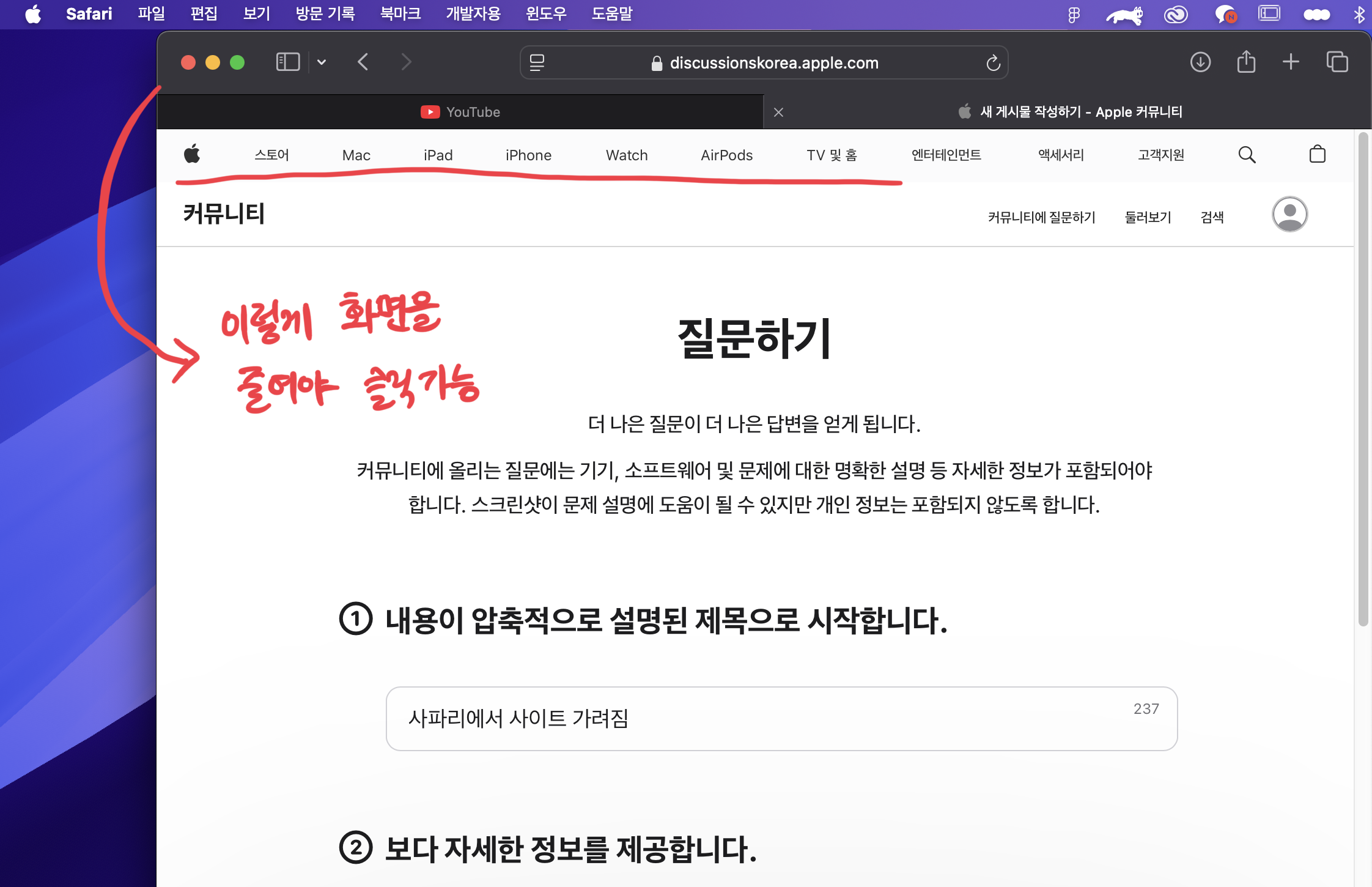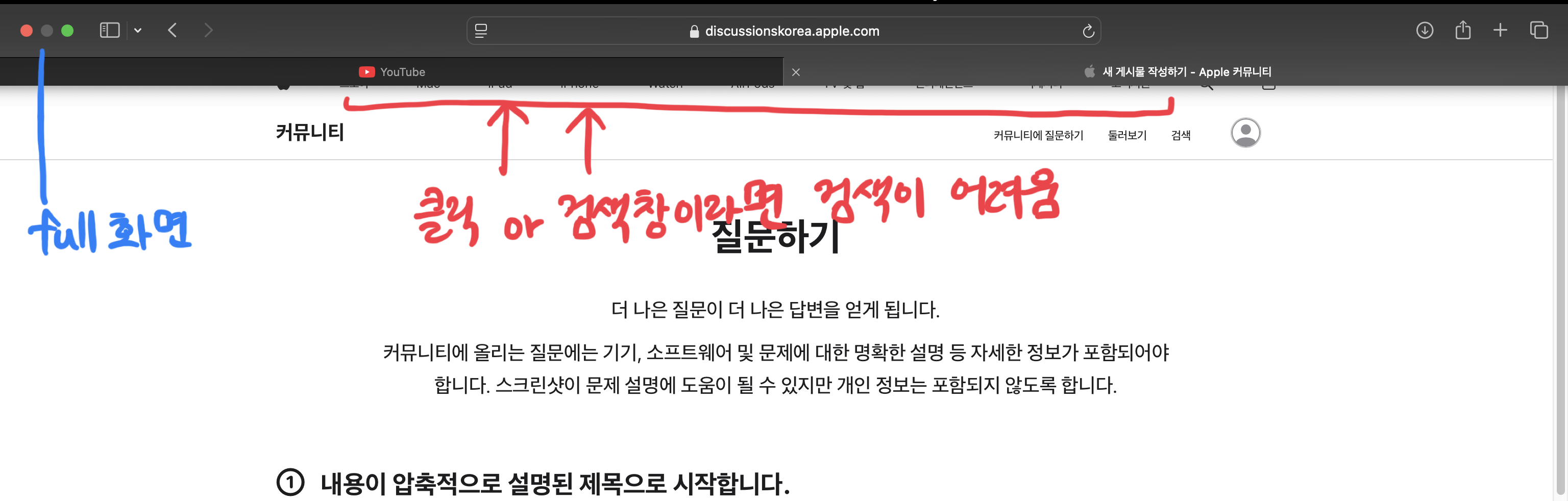 그래서 사파리 화면 사이즈를 줄여서 클릭해야 하는 불편함이 있는데, 도구막대를 항상표시< 해제를 해도