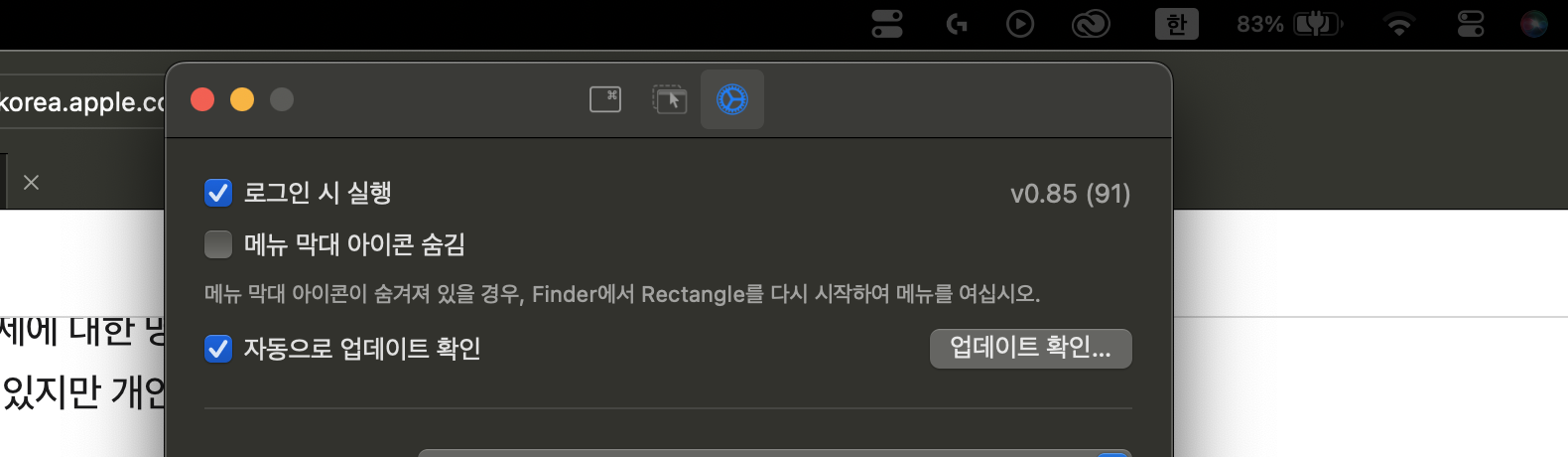 아래 이미지를 보시면 Rectangle 앱 설정에서 '메뉴 막대 아이콘 숨김' 항목에 체크 해제했는데