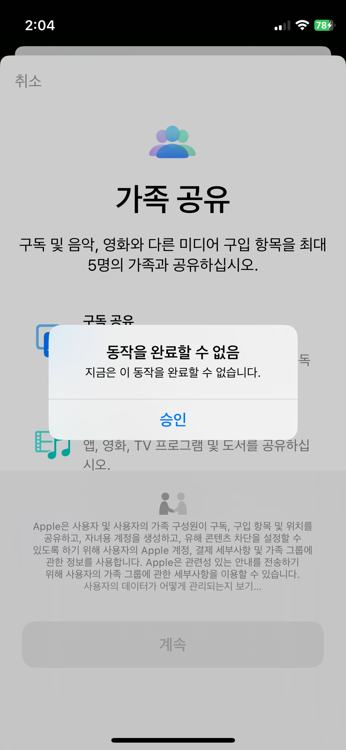 애플뮤직 가족공유를 시작하려고 했는데요 초대를 받고 수락을 누르면 지금은 이 동장을 완료할 수 없다고 뜨는데 해결방법이 없나요?