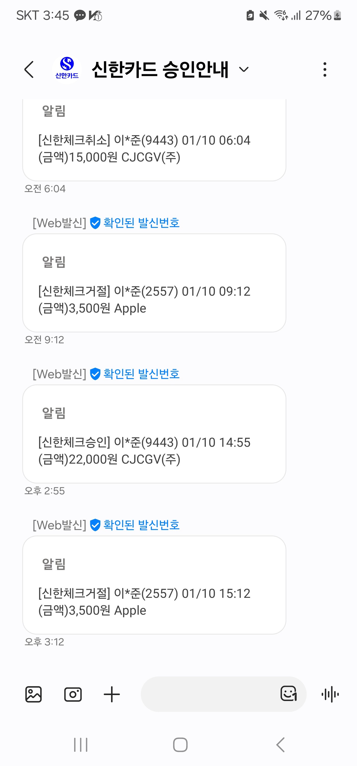 다만 이 사진과 같이 체크카드 결제 거부가 수십통씩 계속 옵니다. 이걸 어떻게 해야 할까요?
