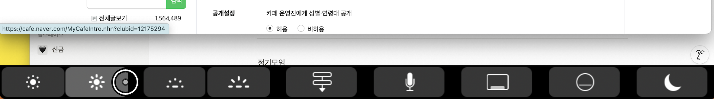 MacBook Pro 13 Touch Bar에서 동그란 원이 표시됨