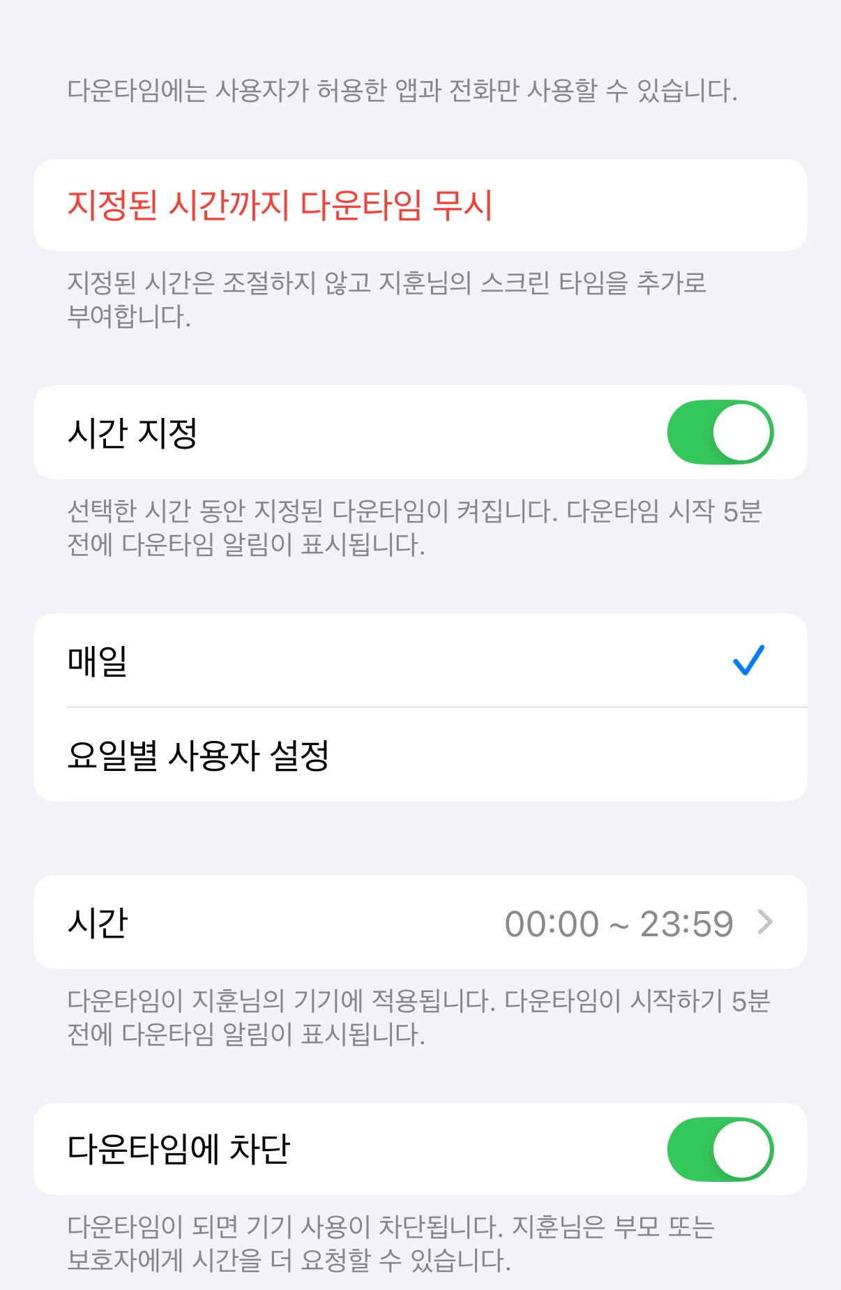 아이가 12미니 를 사용하고 있고 워치도 os 11.32버전의 애플워치 시리즈 7 입니다. 스크린타임으로 인터넷 카톡등 제한두려고 다운타임설정해놓았는데 운동어플, 워키토키, 정도는 되게하고싶은데 다운타임을 지정해놓으니 활용이 안됩니다. 다운타임 상관없이 특정어플이 워치에서 사용되게는 할 수 없나요?