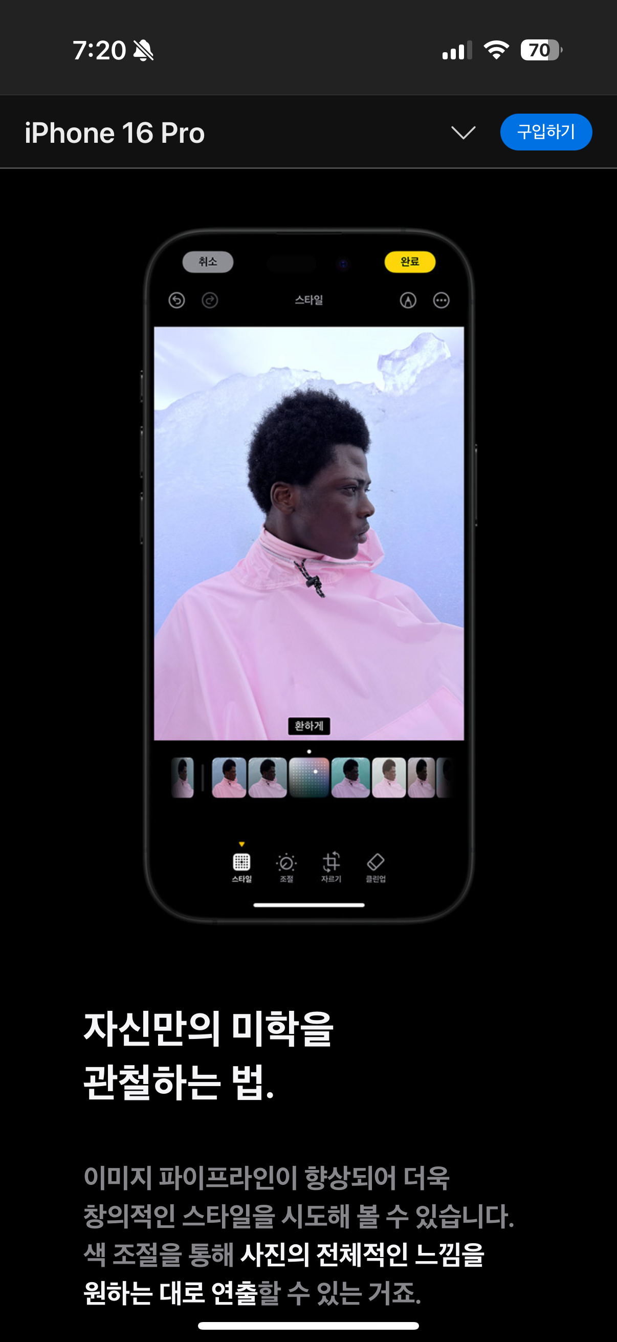 그런데 애플 홈페이지의 아이폰 16 프로 상세페이지 중간에 보면 스타일 기능에 대한 설명 중 아래 캡쳐 부분을 보면 사진 앱의 수정 모드에서 스타일을 선택하거나 이미 촬영된 스타일을 수정할 수 있는 것으로 보여지는데요.