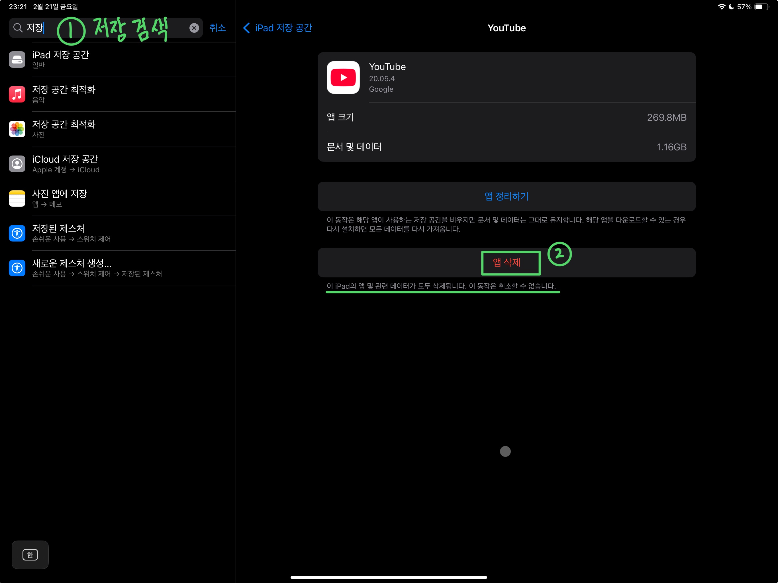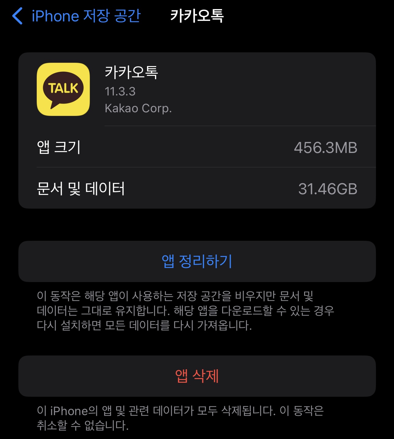 앱을 삭제하는것이 아닌 앱데이터를 삭제하면 저장공간을 확보하실 수 있습니다