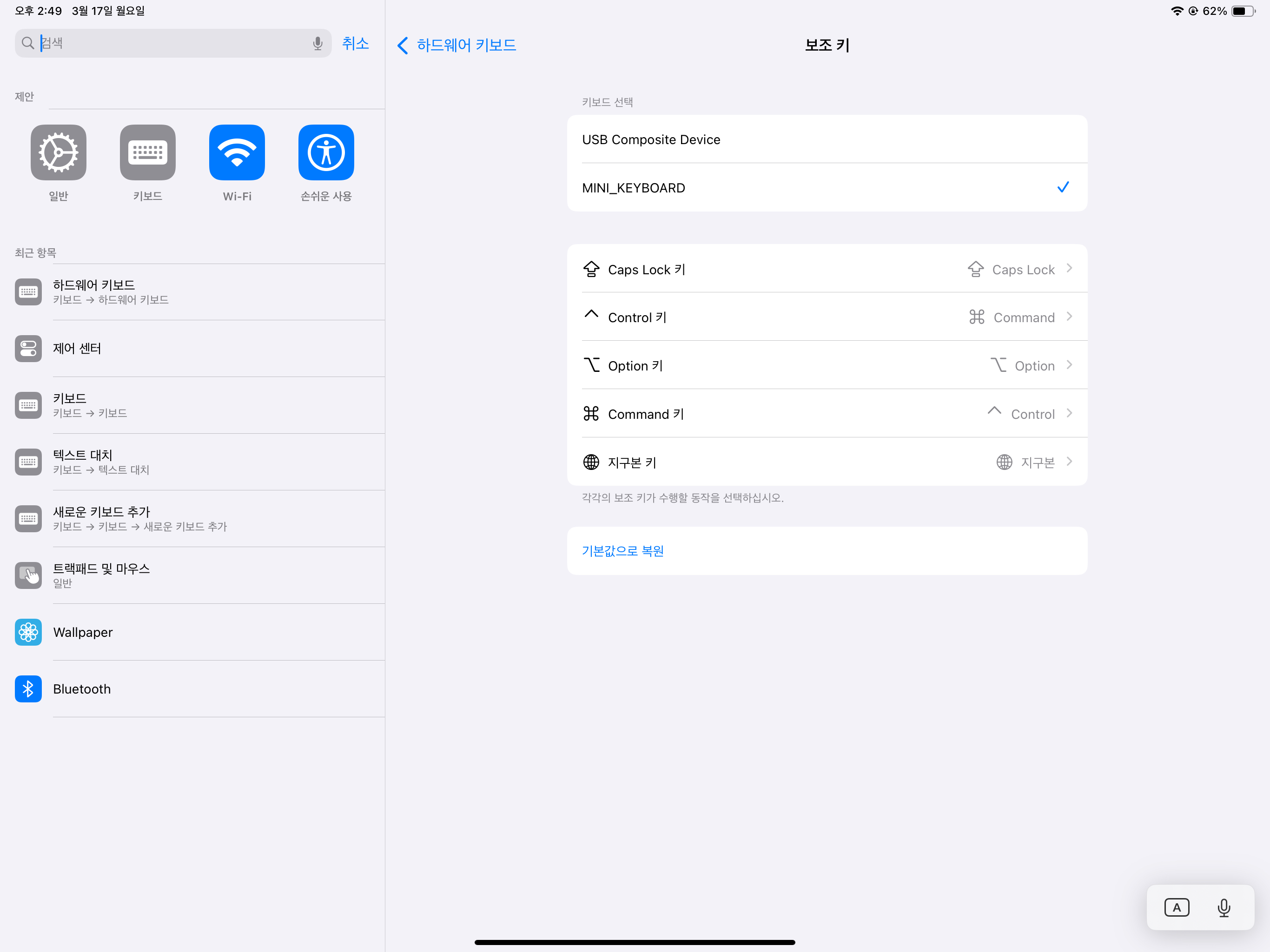 블루투스 키보드의 컨트롤 키를 커맨드로 바꿔서 사용하고 싶은데