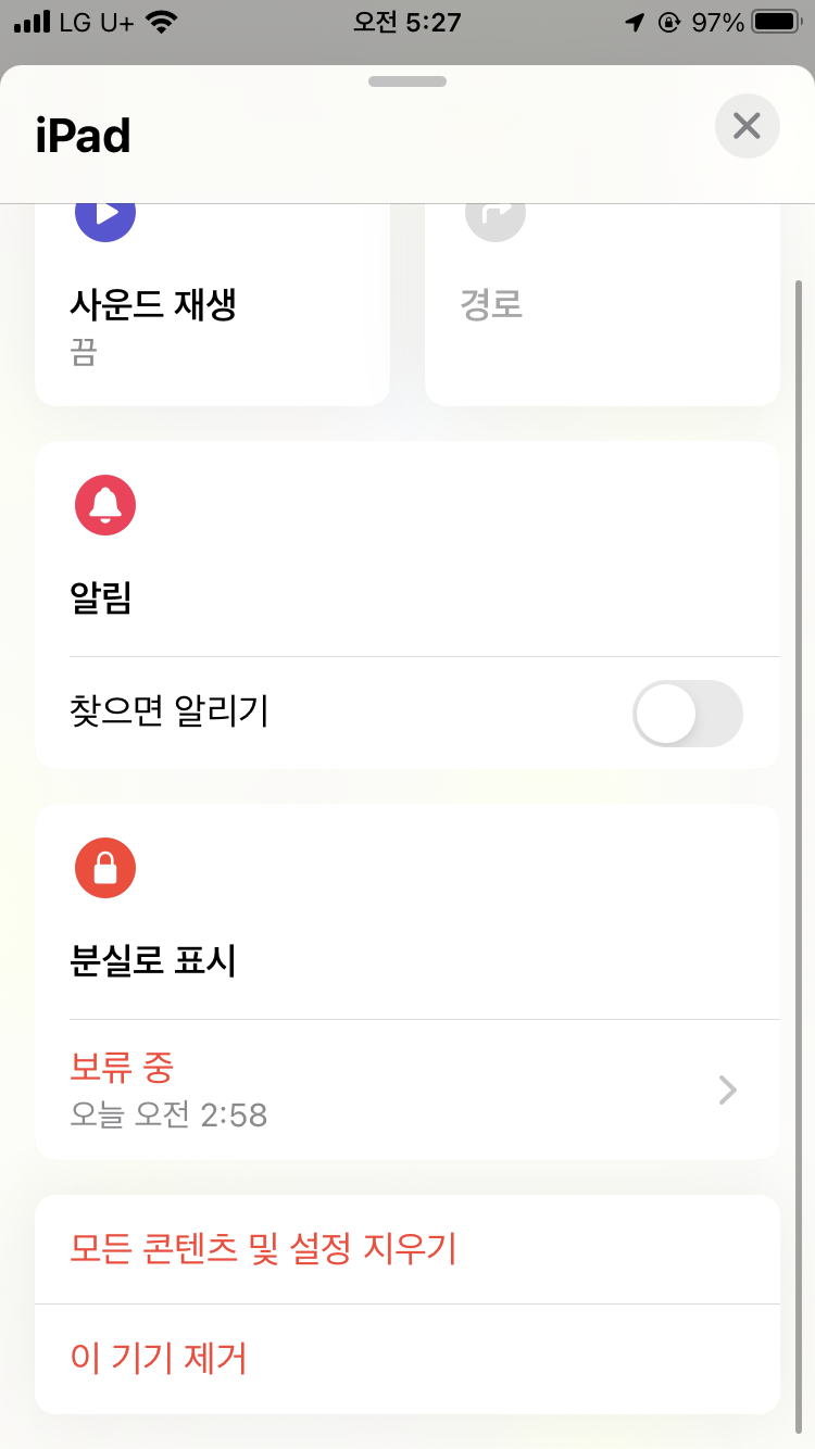 분실한 iPad가 '나의 찾기'에서 보류중으로 확인됨