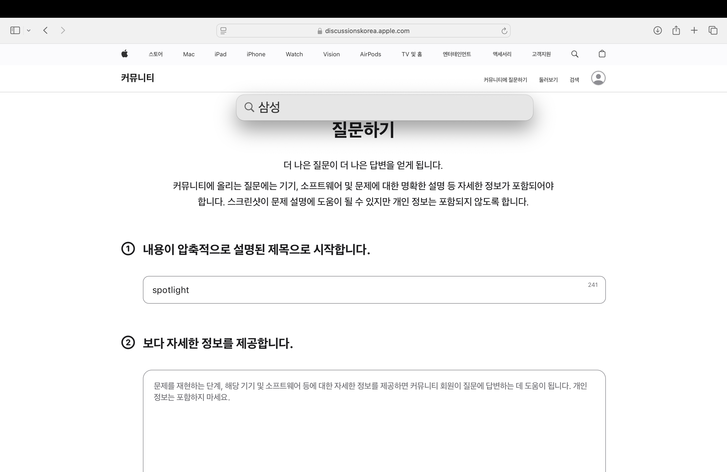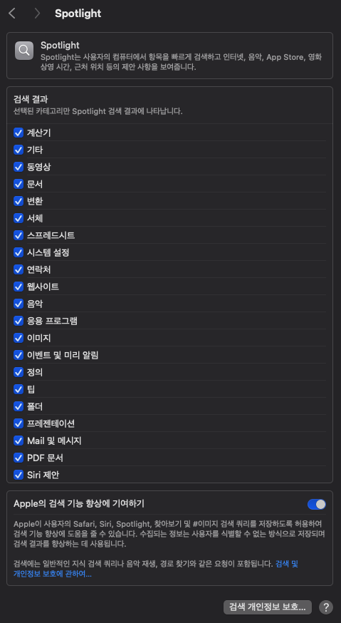 Macbook의 Spotlight에서 검색하는 옵션이 안 뜸