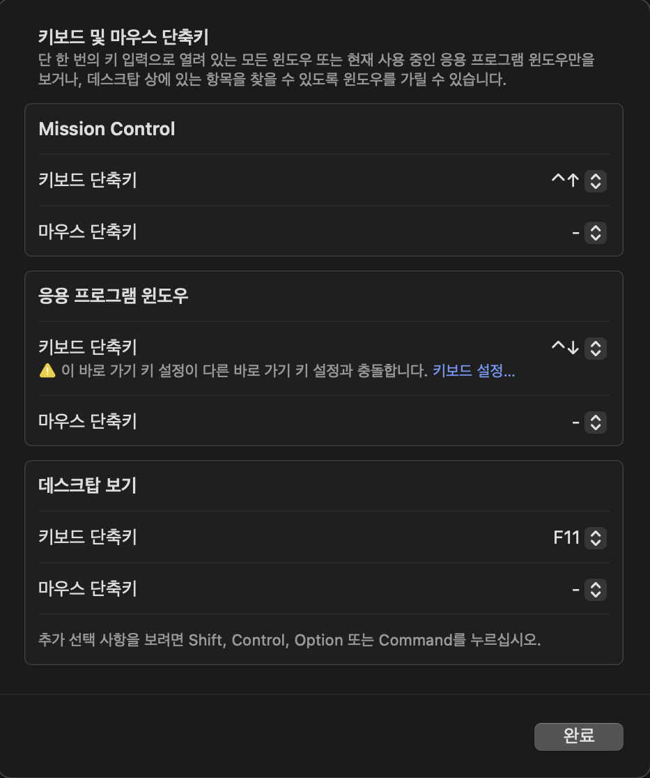 시스템 설정 -> 데스크탑 및 Dock -> 제일 아래에 단축키 들어가 보면 응용프로그램 윈도우에 키보드 단축키 밑에 알림 '이 바로 가기 키 설정이 다른 바로 가기 키 설정과 충돌합니다. 키보드 설정...' 있는데 아무것도 키 설정한 곳이 없는데 이 알림이 왜 생기는지 모르겠음. 알림 안 나오게 수정 방법 부탁드립니다.