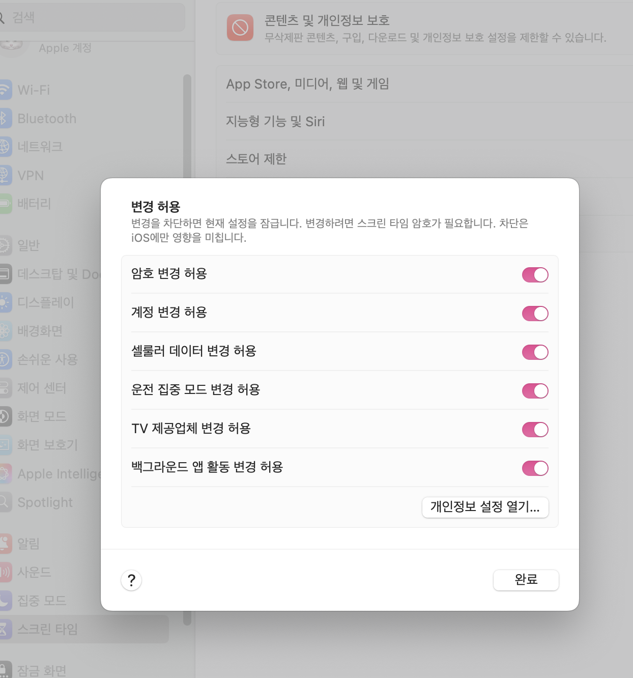 Handoff 기능이 안돼서 키려고 확인해 봤는데 "이 설정은 특정 프로필에 의해 구성되었습니다." 라는 문구가 뜨고 활성화버튼이 잠겨있습니다. 개인 노트북이고, 변경허용 설정 다 켜놓았습니다. 재부팅도 해보았고 iCloud 로그아웃도 했다가 재로그인도 해보았습니다.