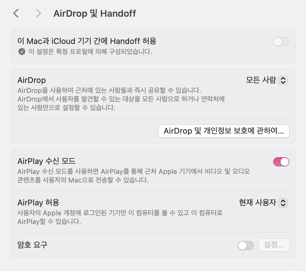 맥북 Handoff 이 설정은 특정 프로필에 의해 구성되었습니다.