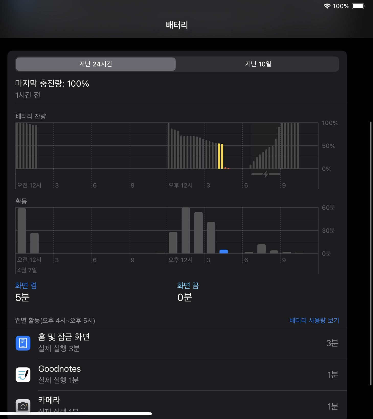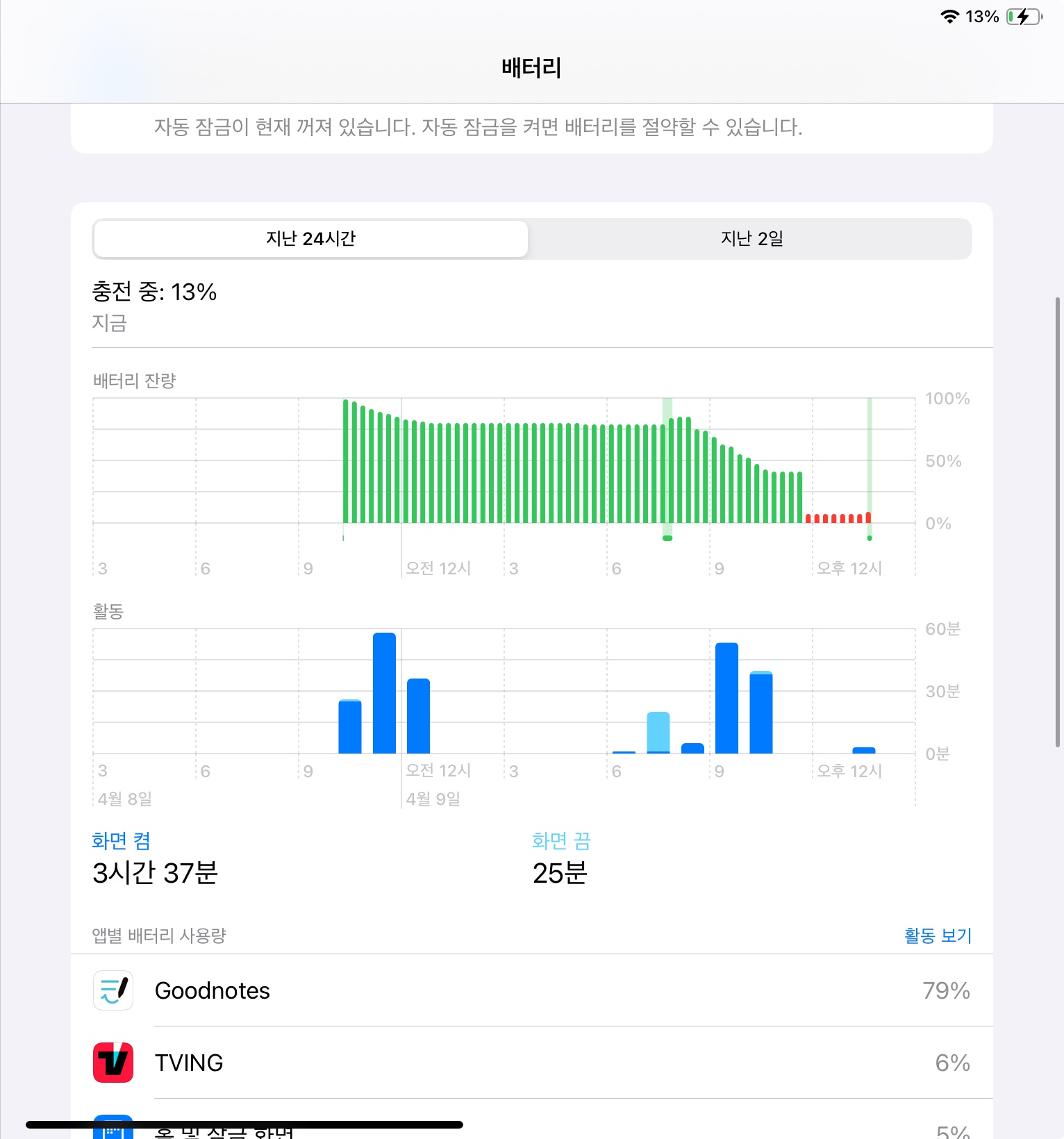 어느 순간부터 배터리가 갑자기 10퍼센트가 한 순간에 딿고 점점 배터리가 없어지는 정도가 늘어납니다. 예전에는 10~20퍼센트 딿았다면 오늘은 한 순간에 50퍼센트가 날라갔습니다. 보증 남아있을 때 공인 서비스 센터에 가봤더니 이상이 없다고 하였고 저번 달에 갔을 때는 보증이 끝나서 진단하는 데 1만원이 들고 만약 이상이 있어 배터리를 교체한다면 80만원이 든다고 하여 그냥 왔습니다. 대학생이라 굿노트나 유튜브 주로 사용하고 게임도 안하고 무리 가는 작업도 안합니다. 혹시 해결법 아신다면 알려주시면 감사하겠습니다. 사진에서 보이는 것처럼 오늘 갑자기 50퍼센트가 날라가서 전원이 꺼졌습니다.