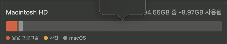 MacBook Air(M3)에서 저장 공간 용량이 음수로 표시됨