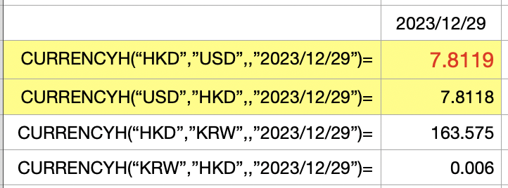 CURRENCYH("HKD","USD",,"2023/12/29") = US$7.8119 이 결과를 해석하면 1 HKD = 7.8119 USD 가 됩니다.