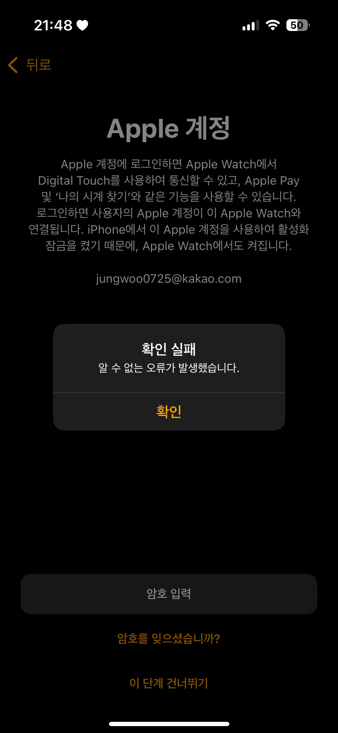 1. iPhone 과 Watch 모두 강제 재시작을 해보세요. Apple Watch 재시동하기 - Apple 지원 (KR) iPhone 강제로 재시동하기 - Apple 지원 (KR)