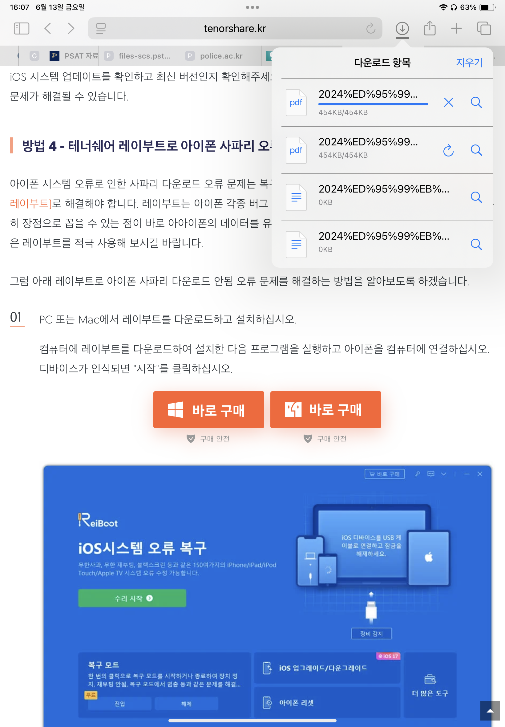 최근 iPhone, iPad의 Safari 에서 파일 다운로드 시 첨부해주신 스크린샷과 같이 진행바는 전부 찼지만, 제대로 파일이 다운로드 되지 않는 오류가 있습니다.