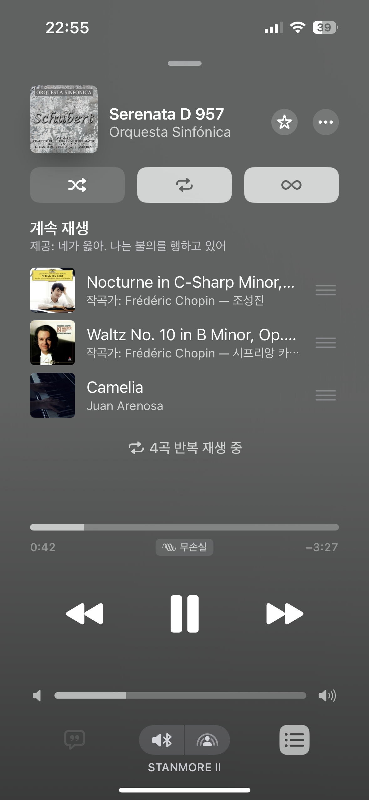 주로 애플뮤직을 통해 음악을 듣고 있습니다만, 플레이리스트를 제작해서 노래를 듣는데 꼭 특정 곡에서 블루투스 연결이 끊깁니다.