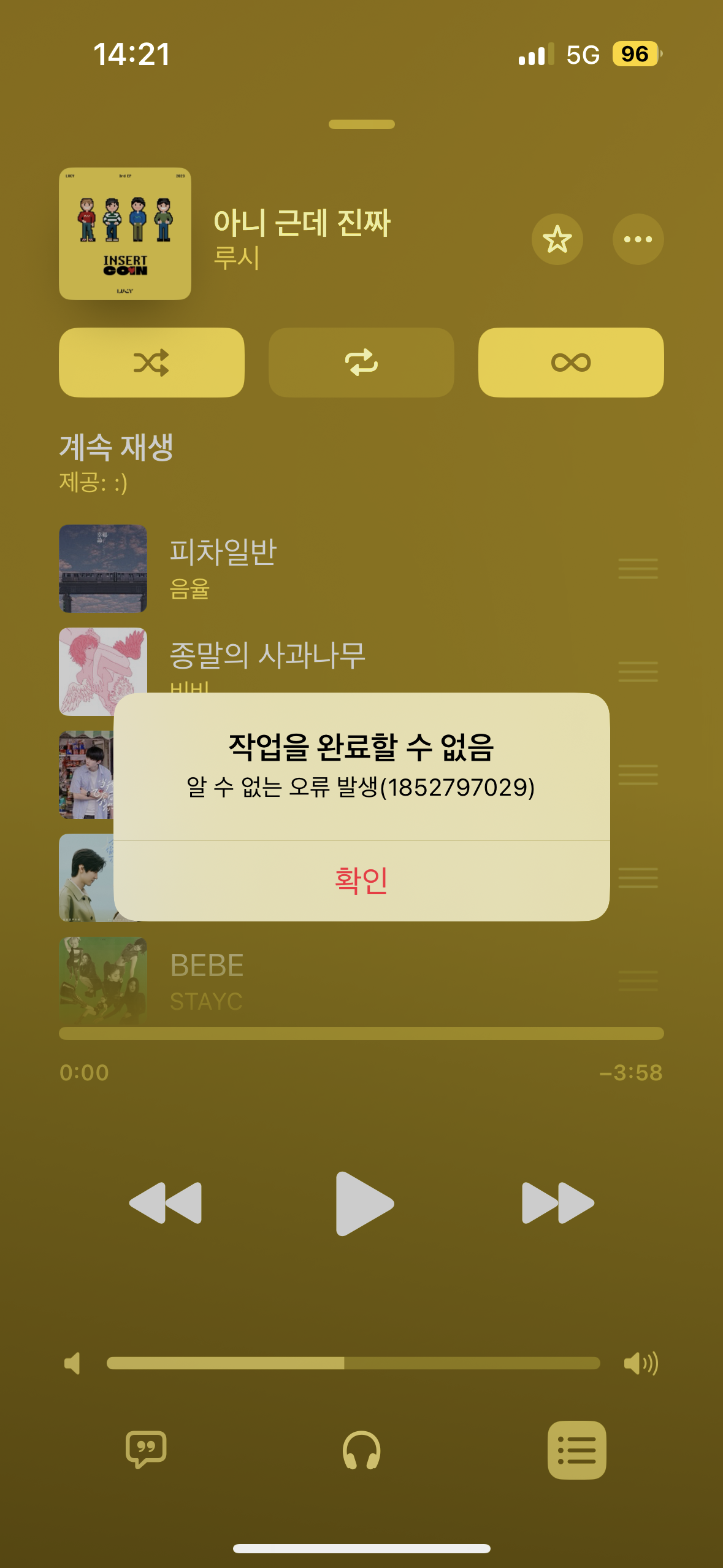 애플 뮤직 가족 구독을 하고 있는데 노래 재생이 되지 않고 노래를 틀때마다 알수없는 오류 화면이 계속 뜹니다. 폰을 재부팅 해도 소용이 없고, 앱을 다시 깔아도 소용이 없음니다