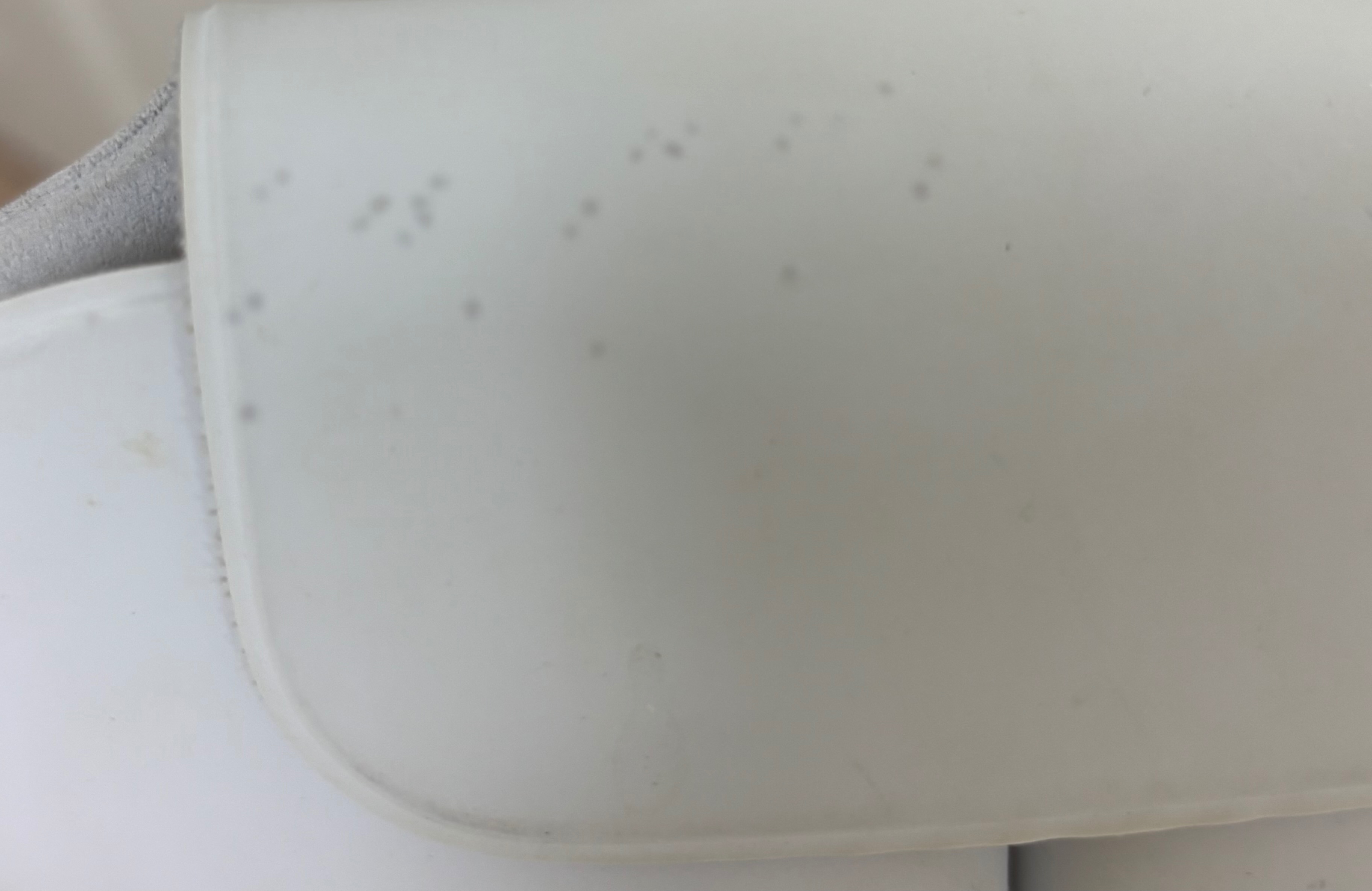 사진상 곰팡이로 보이는것 같은데 플라스틱 부분은 IPA(이소프로필알콜) 티슈로 닦고, 패브릭은 미지근한 물에 중성세제를 풀어 세척해보시기 바랍니다.