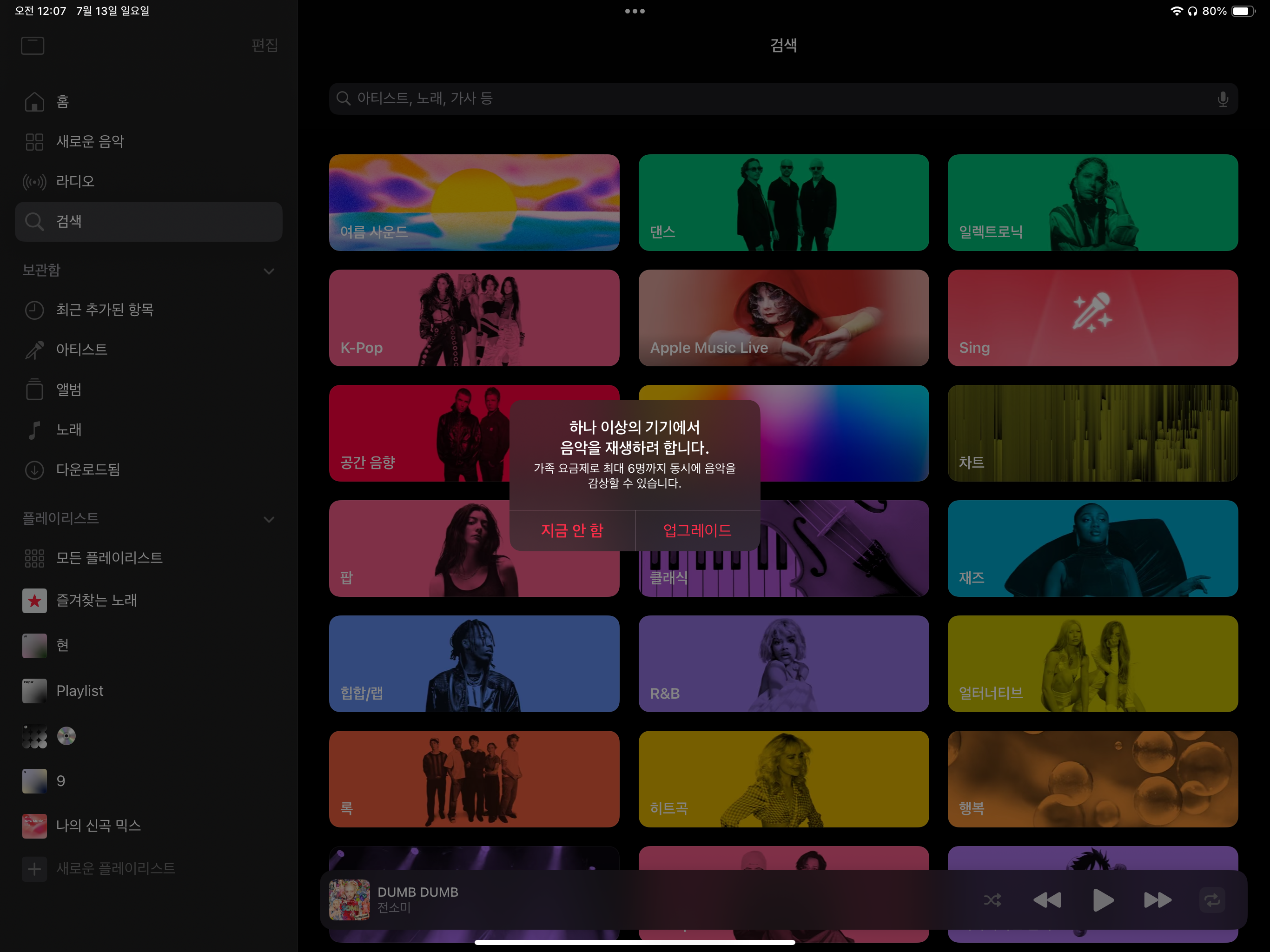애플뮤직 개인 구독을 이용하고 있습니다. 3-4일 전부터 애플뮤직에서 음악을 재생할 때마다 3분 간격(짧게는 1-2분)으로 음악 재생이 중단되고 “하나의 기기에서 음악을 재생하려고 합니다”라는 메시지가 표시됩니다.(사진첨부 하였습니다.)처음에는 다른 사용자가 제 계정에 로그인하여 음악을 재생하는 것으로 생각하여 로그인된 기기를 정리하고 비밀번호 변경도 하였습니다. 이후 애플 계정 재로그인, 기기 재부팅, 애플뮤직 재다운을 시도했으나 동일한 문제가 지속되어 문의드립니다.