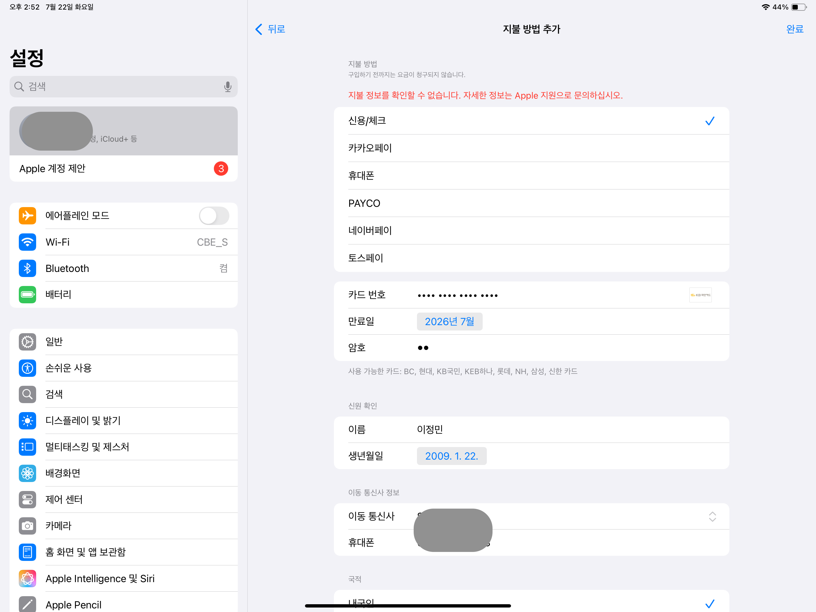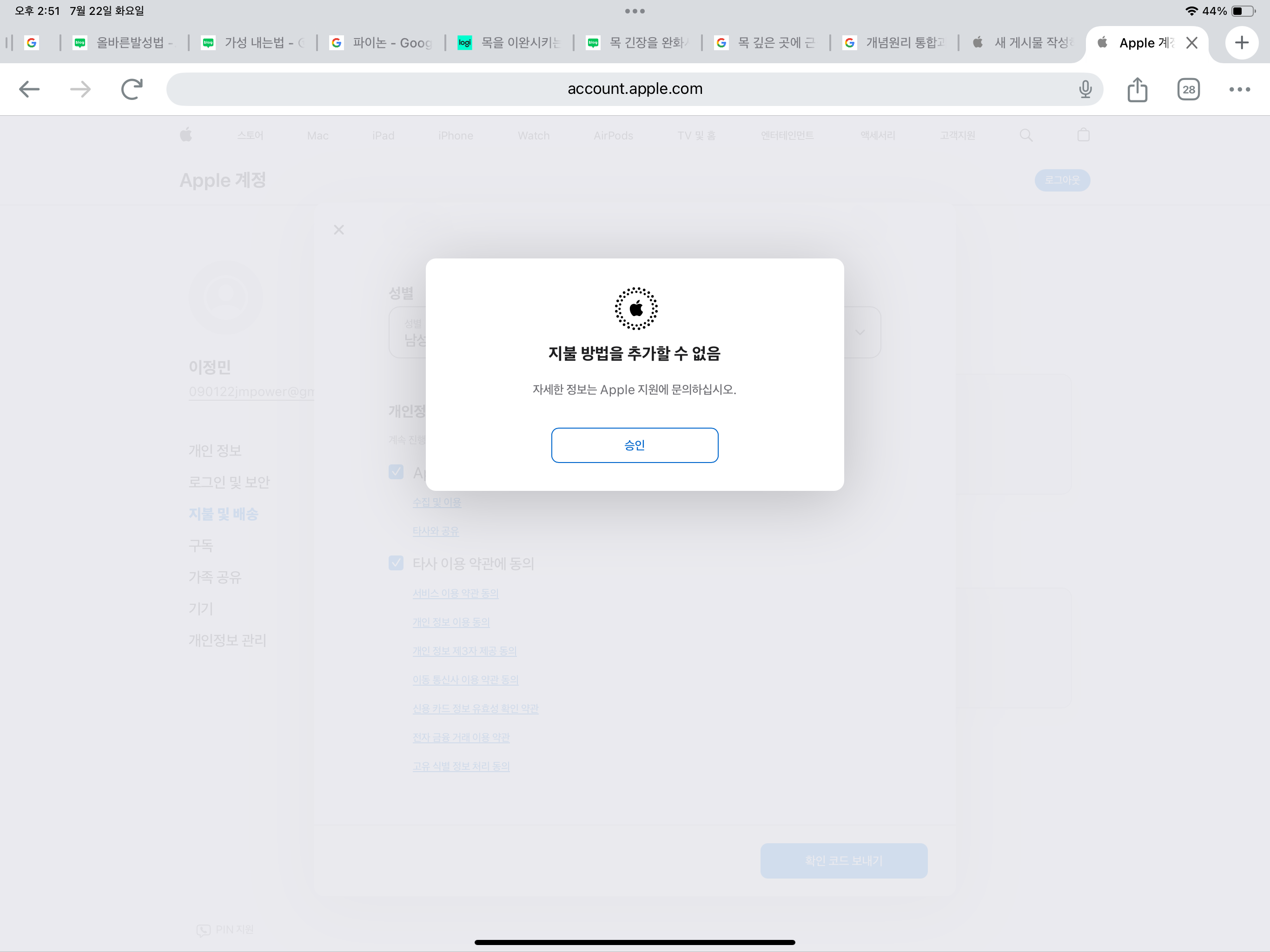 Apple 계정에 결제 방법을 업데이트할 수 없음