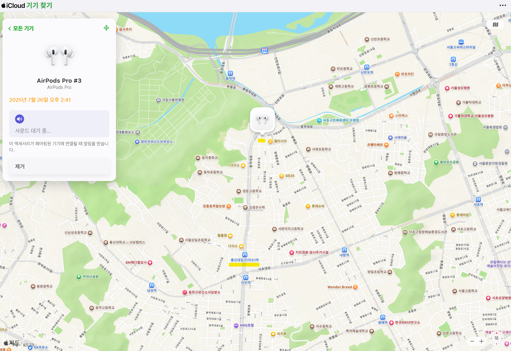 현재 에어팟 위치인 충신대입구역 근방으로 뜨지만