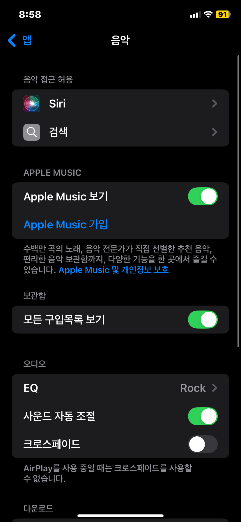 iPhone 11 & iOS 18.5 음악 앱에서 Dolby Atmos 설정 옵션이 표시되지 않음