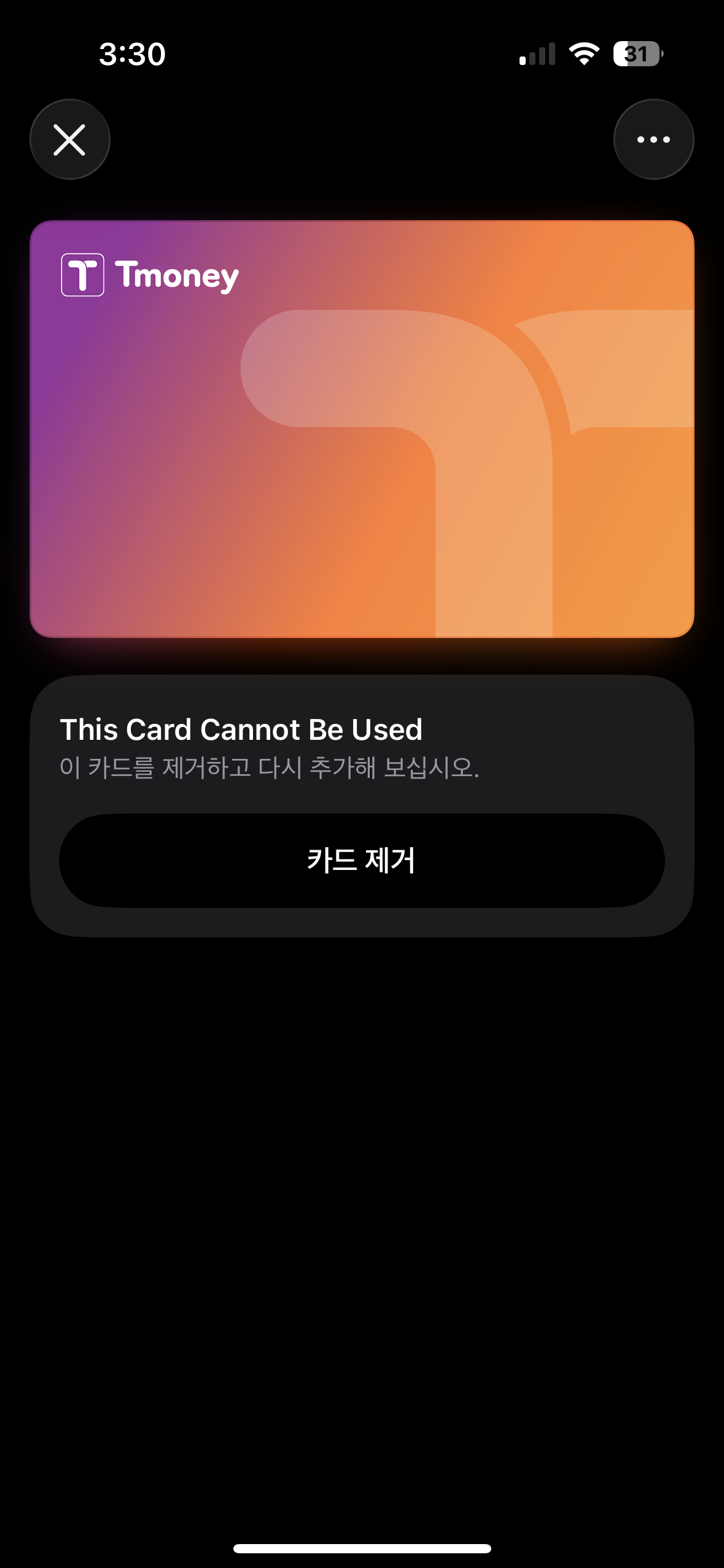일단 문제가 발생한 티머니를 지갑 앱 을 통해 "..." 버튼을 누른 후 카드 세부 사항으로 가셔서 해당 카드를 완전히 지운 후 다시 추가해 보시기 바랍니다.
