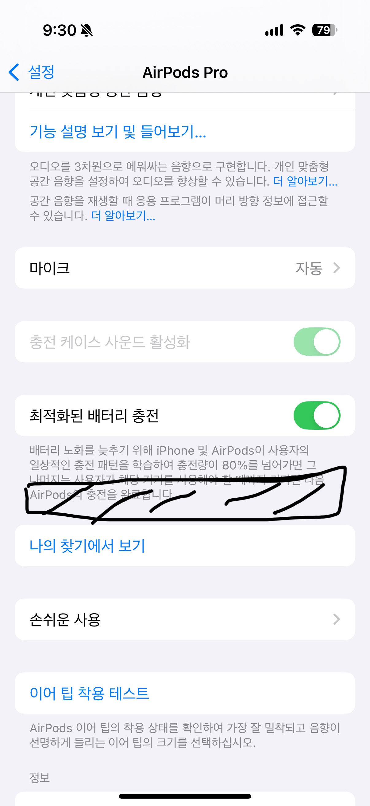 나의 찾기 앱에서 AirPods Pro(2세대) 경로 이외의 다른 기능 사용 불가