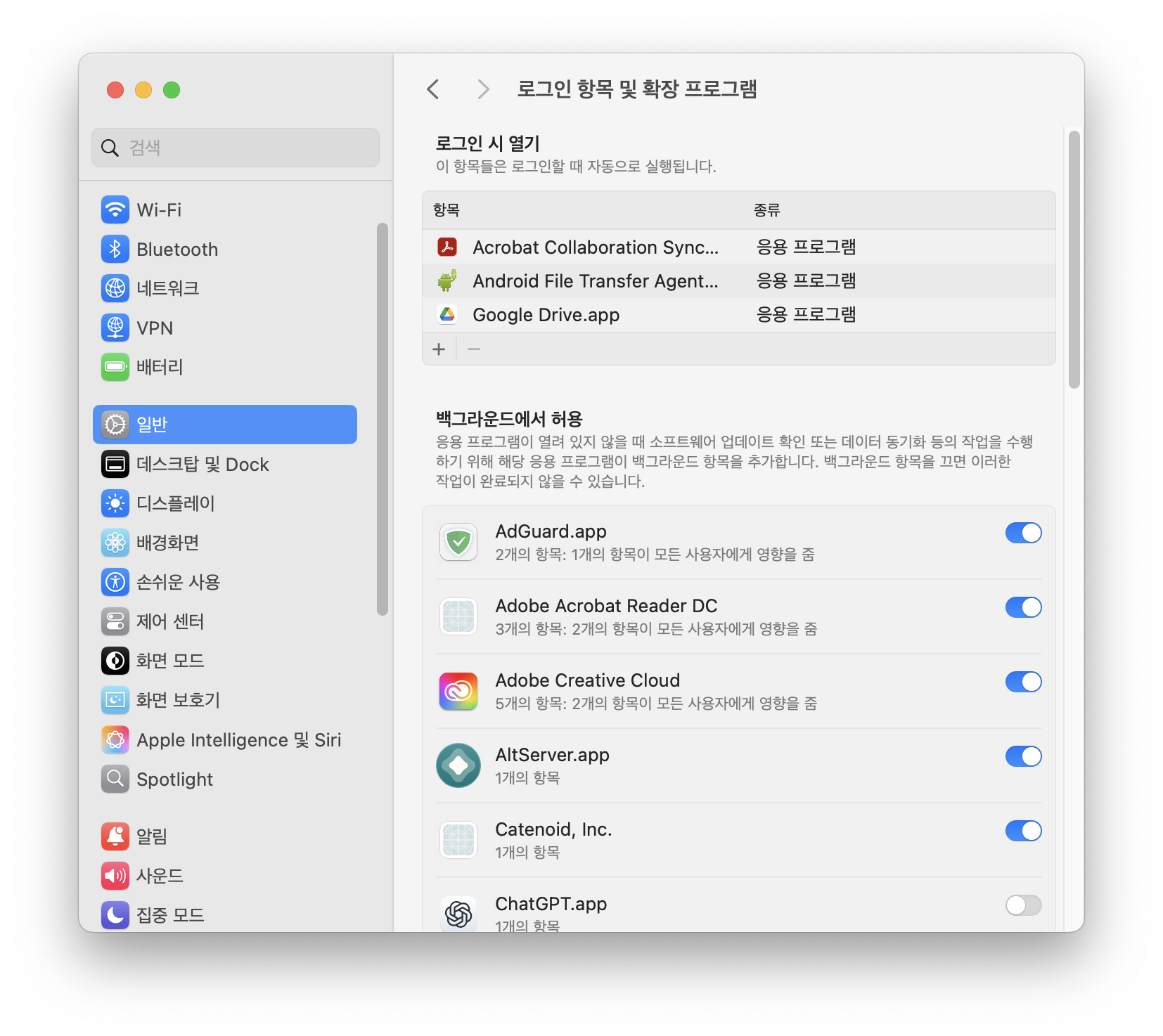 설정 앱 > 일반 > 로그인 항목 및 확장 프로그램에서 '로그인 시 열기'에 앱이 추가되어 있는지 확인해보세요.