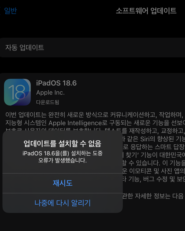 아이패드 7세대 소프트웨어 업데이트가 계속 안 됩니다. 다운로드 후 6기가 정도 남은 상태이고, 재부팅과 인터넷 연결, 업데이트 파일 삭제 후 재설치도 여러 번 했는데 계속 이 화면만 뜹니다…해결 방법 없을까요?
