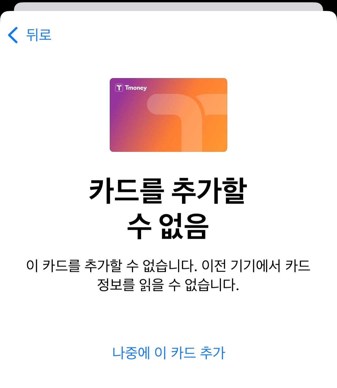iPhone 기기 변경 후 티머니 카드를 Apple 지갑에 추가할 수 없음