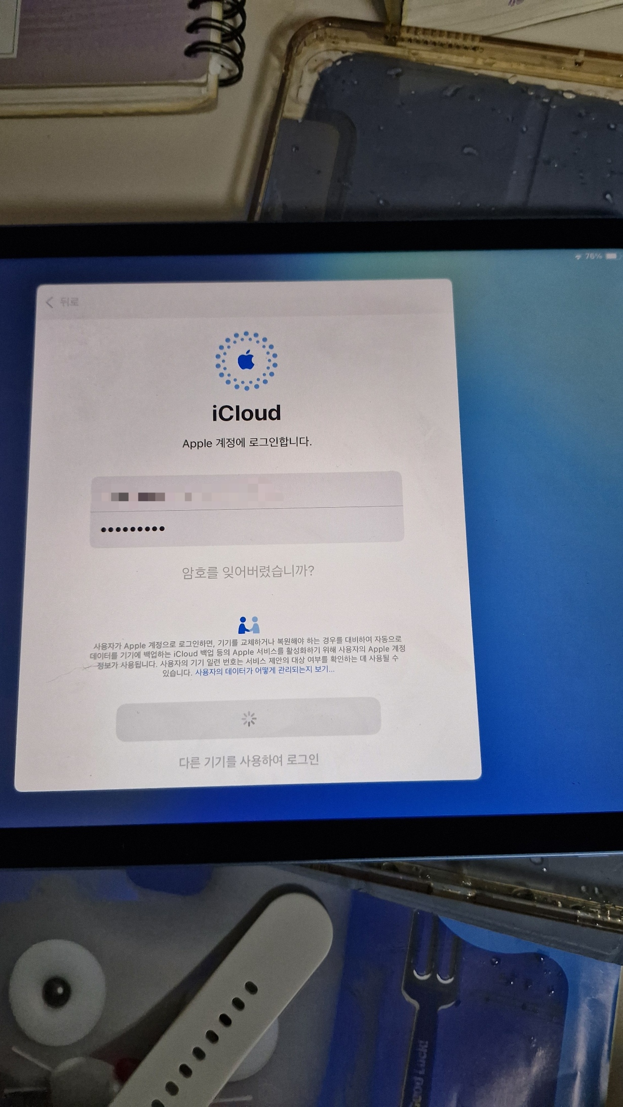현재 아이패드 고장으로 인해 새로운 아이패드를 받고 아이클라우드에 저장된 데이터를 불러오는 과정을 하고 있었습니다. 그러나 아이클라우드에 로그인 하는 과정에서 아래 사진에 나온것처럼 로그인이 되지 않고 지연되는 것처럼 보이는 현상이 10분 이상 지속되고 있습니다. 이러한 과정이 아이패드를 복구하기 위한 정상적인 과정인지 아니면 비정상적인 과정인지 궁금합니다